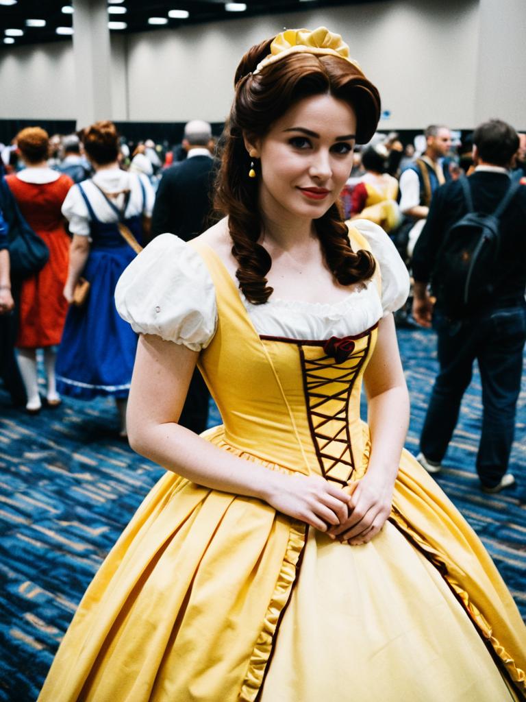 Woman in Belle Dress, candid cosplay portrait at fantasy convention