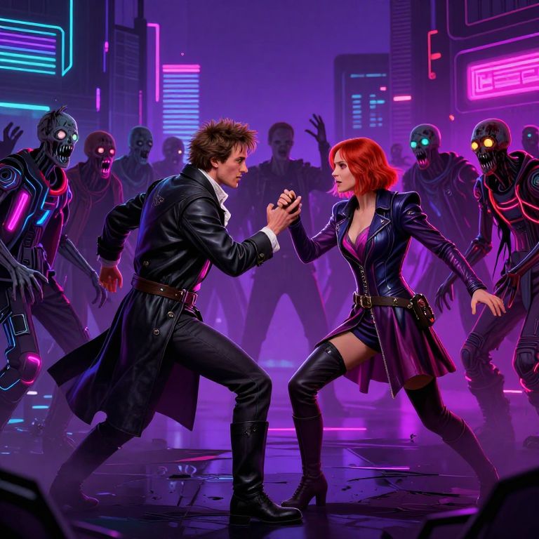 In this vibrant digital artwork, a muscular man with spiked brown hair and a black leather coat faces off with a red-haired woman in a tight black leather dress and thigh-high boots. They stand in a neon-lit, futuristic cityscape with glowing purple and pink signs. Surrounding them are menacing, skeletal zombies with glowing eyes, adding tension. The man and woman are locked in a fierce, determined dance, with the zombies advancing in the background. The scene is dynamic and intense, with vivid colors and sharp contrasts, evoking a cyberpunk aesthetic.