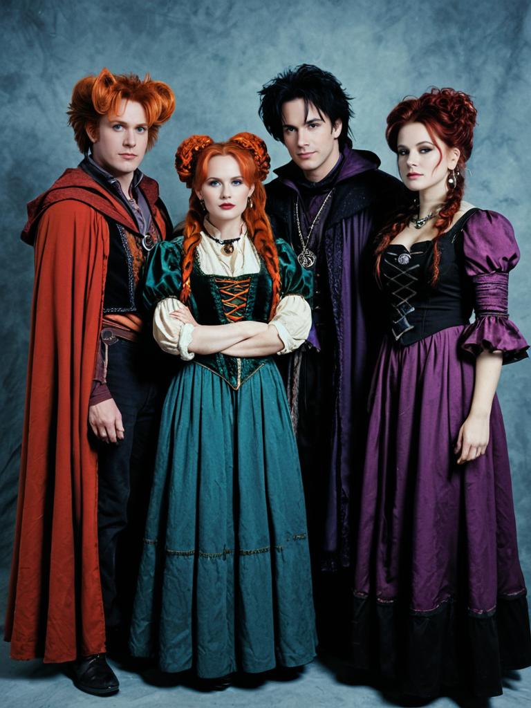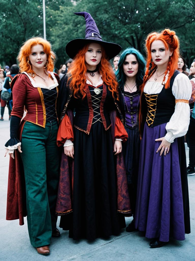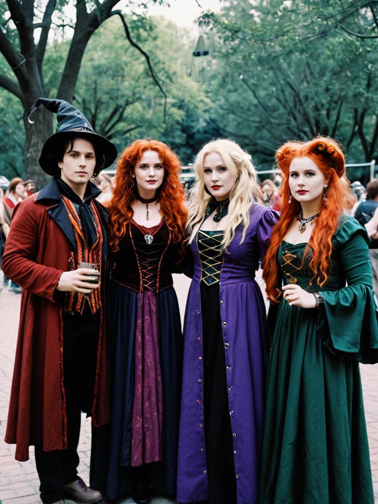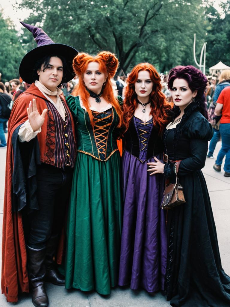 Group in Hocus Pocus Cosplay, cosplay festival group photo, photorealistic realism