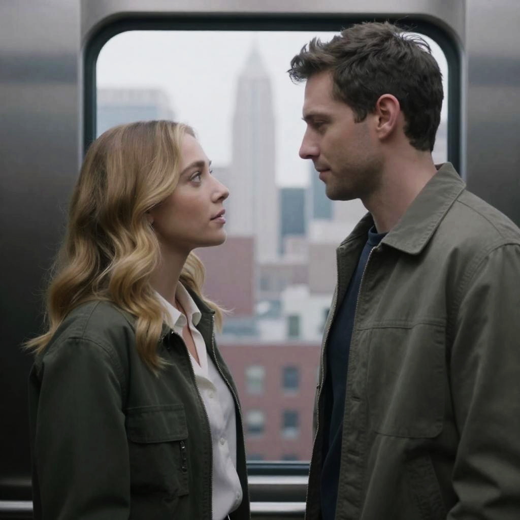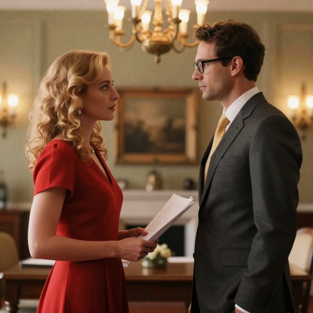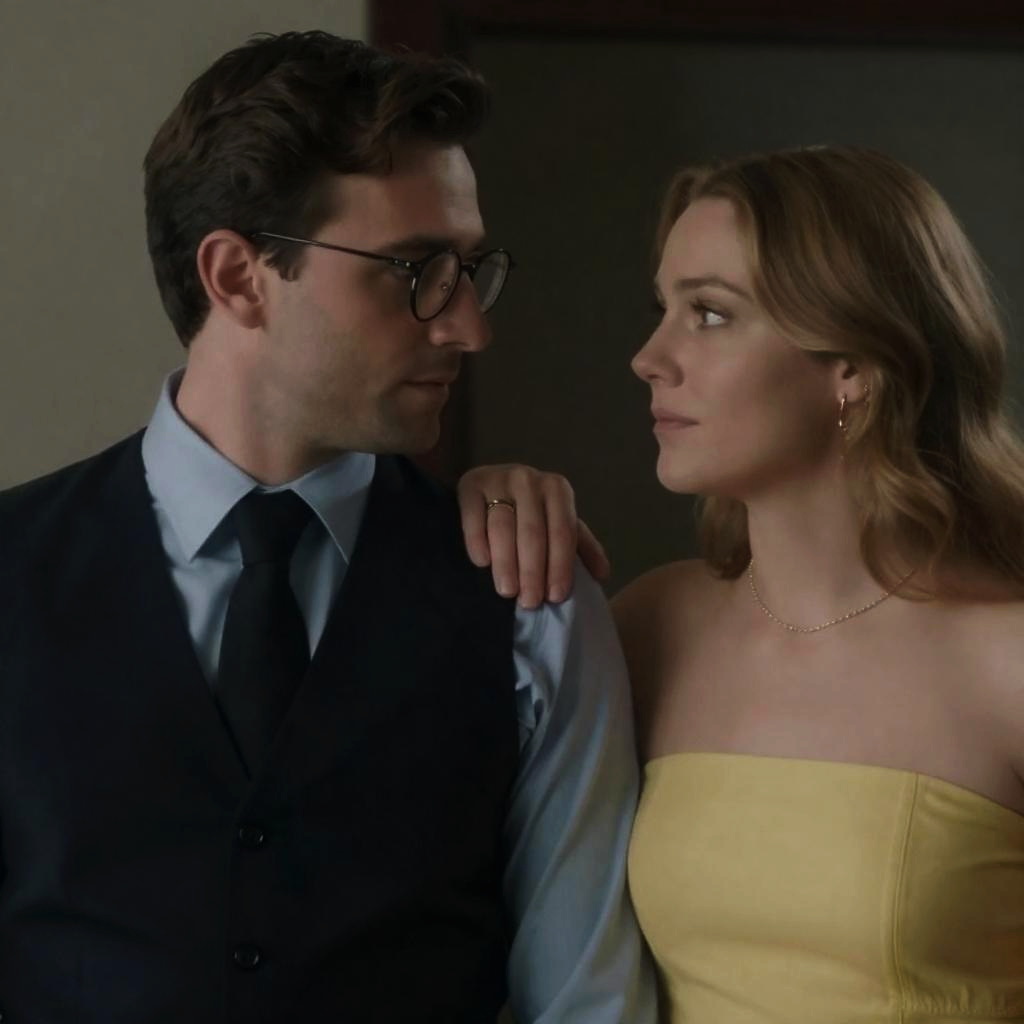 Photograph of two people facing each other in front of a marquee with neon lights. Woman with blonde hair in a bun, wearing a dark ured jacket, smiling. Man with short brown hair, glasses, and a dark shirt, smiling back. Bright marquee lights and neon sign in the background. Both standing close, upper bodies visible. Warm indoor lighting.