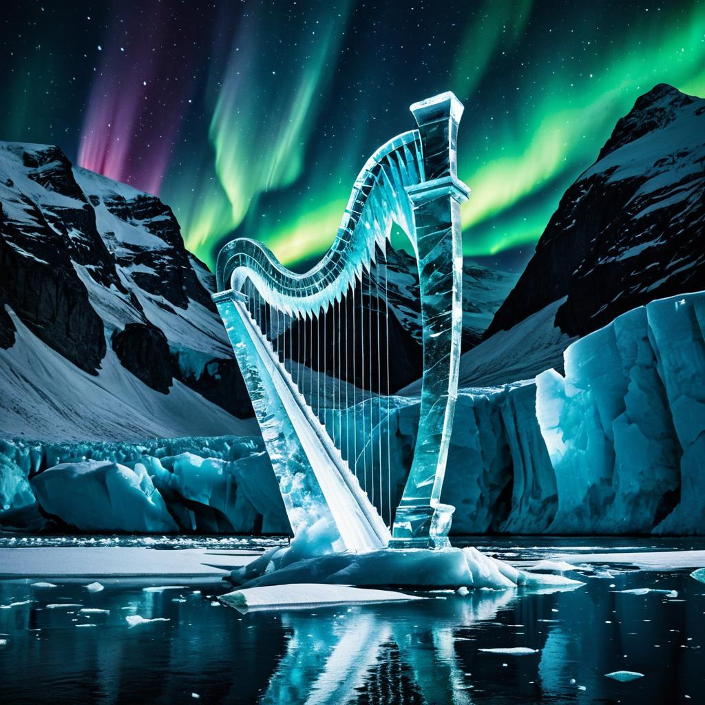 Ice painting of an ancient icy ruin with frost-covered statues set against a deep frozen valley under moonlight, with sparkling ice effects and dramatic lighting.