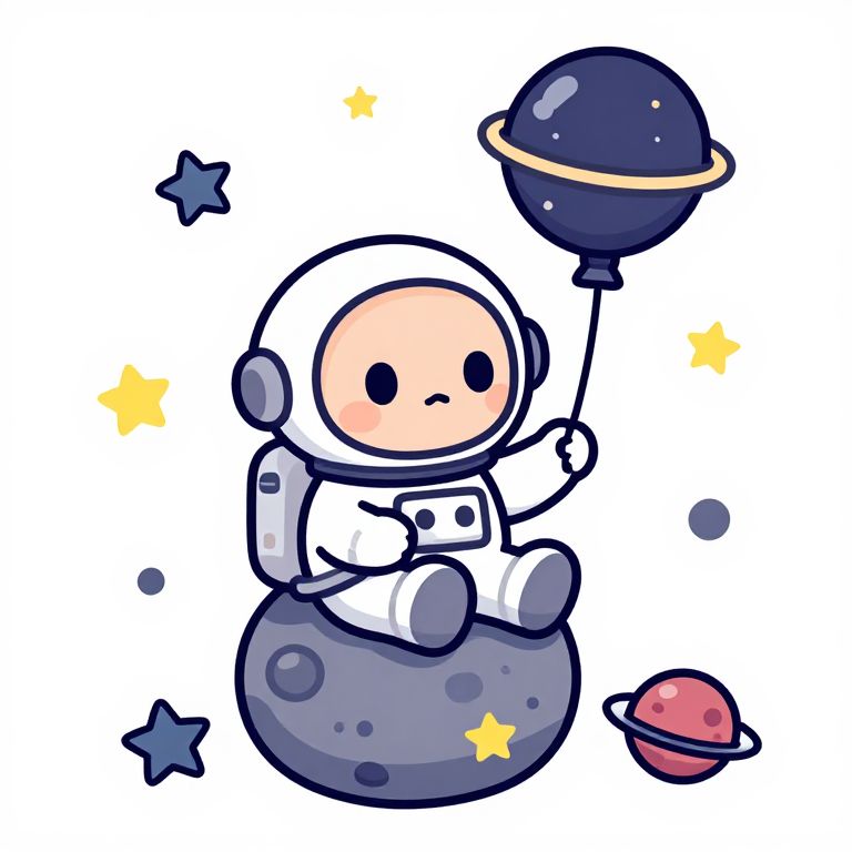 Wide-Angle Still Life cute baby astronaut sitting on the moon holding stars e planets as baloon, sticker, vector, white background, character concept from Hollow Knight,
