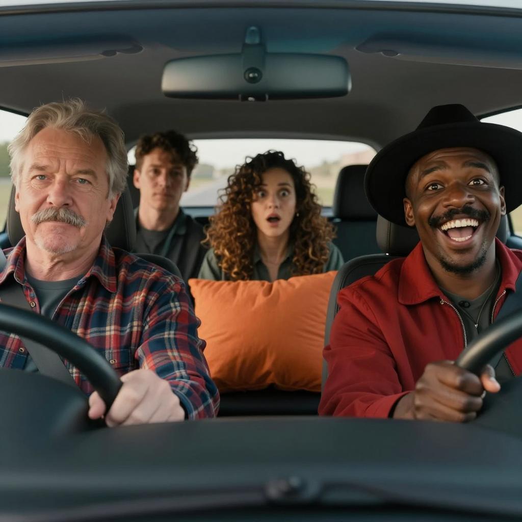 Illustration of a car's rearview mirror showing two people's faces. An African American man with curly hair and a mustache looks ahead, and an elderly white woman with glasses and a hat looks to the right. The car's headrest is above the mirror.