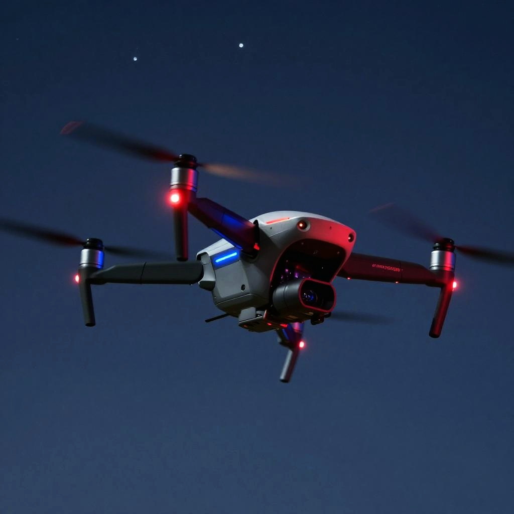 Drone with red and blue lights captured mid-flight against a starry sky, sleek metallic body with glowing accents, dynamic motion blur, sci-fi aesthetic