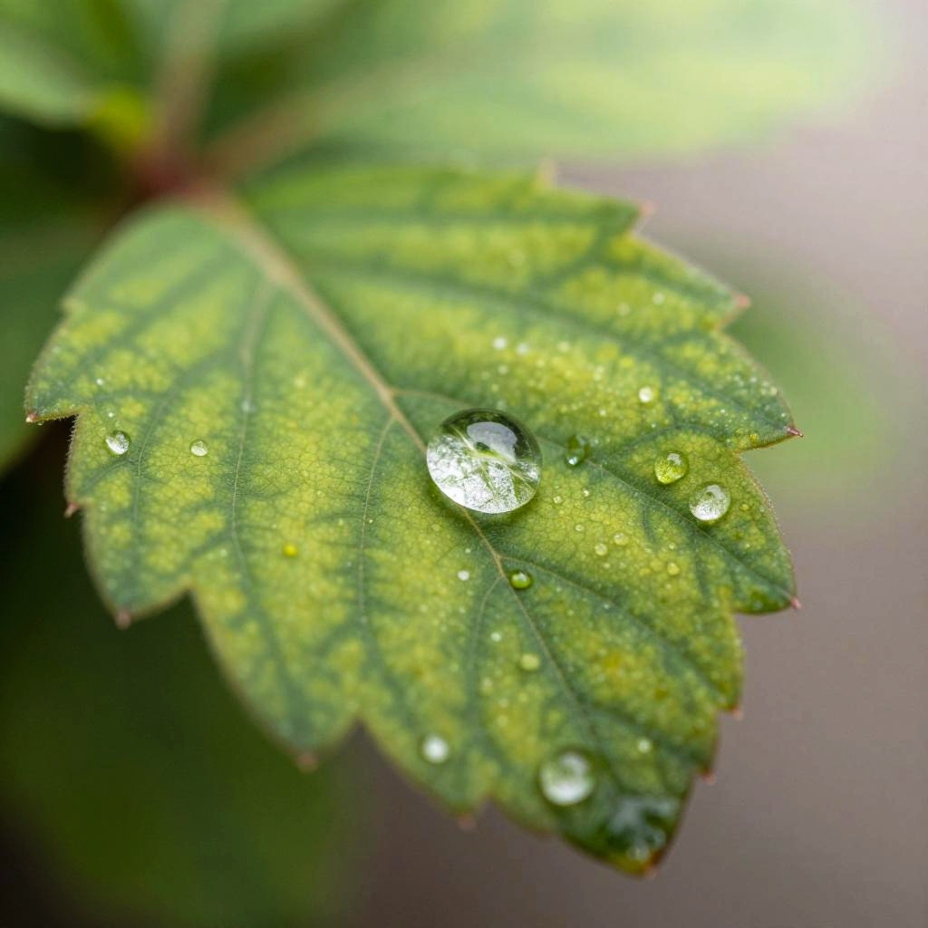Cu close-up of a sparkling dewdrop on a vibrant green leaf in early morning light, showcasing intricate natural textures and soft bokeh background, ultra-realistic macro photography style