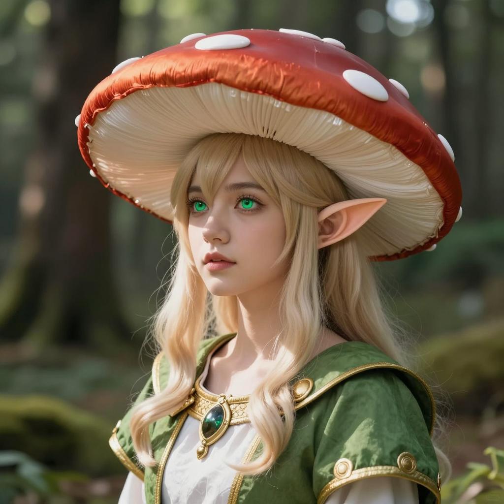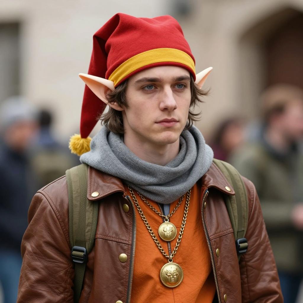 Elf fancy costume, photograph of a young woman with long brown hair, green elf hat with red stripe, pointed elf ears, green tunic with brown buttons, red scarf, fair skin, blue eyes, slightly serious expression, outdoor setting, bright sunlight, blurred background with people and orange structures, fantasy cosplay, realistic style, detailed ures, slight bokeh effect