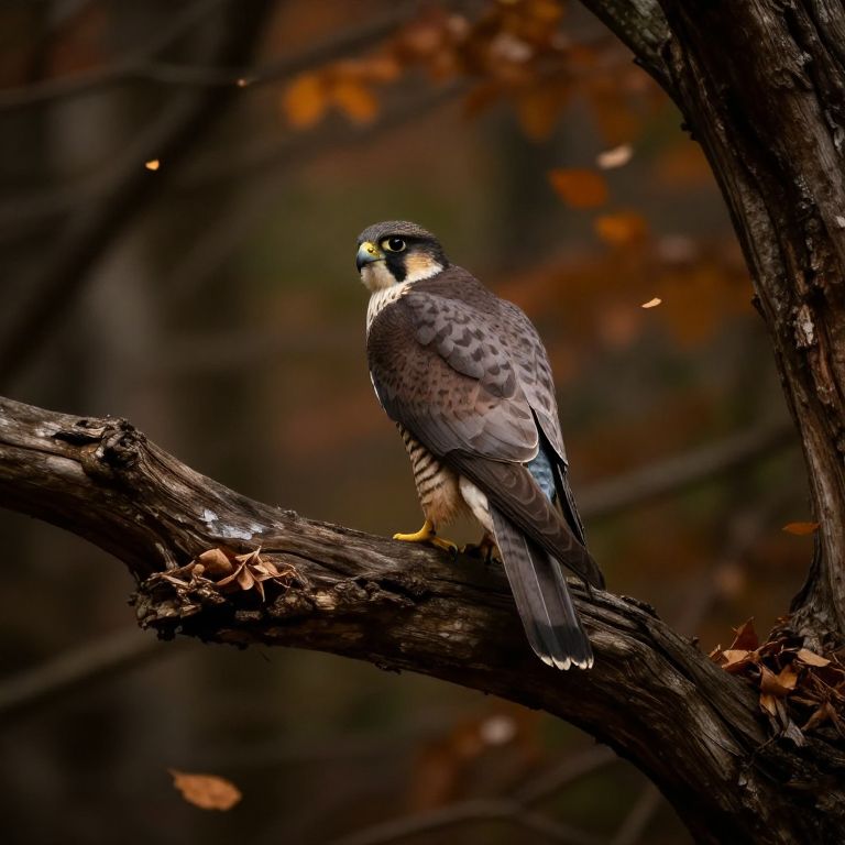 Falco perched on a twisted ancient tree branch in a dense forest, autumn leaves falling gently around, intricate textures on feathers, rich earth tones, moody ambient lighting creating a mystical and serene atmosphere, hyper-realistic nature scene.