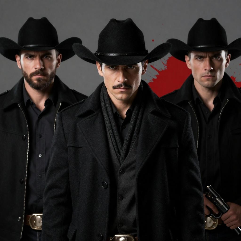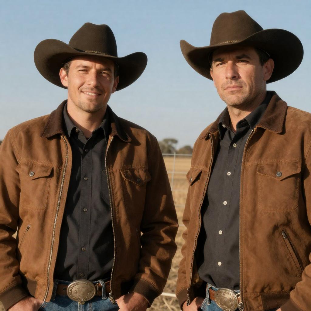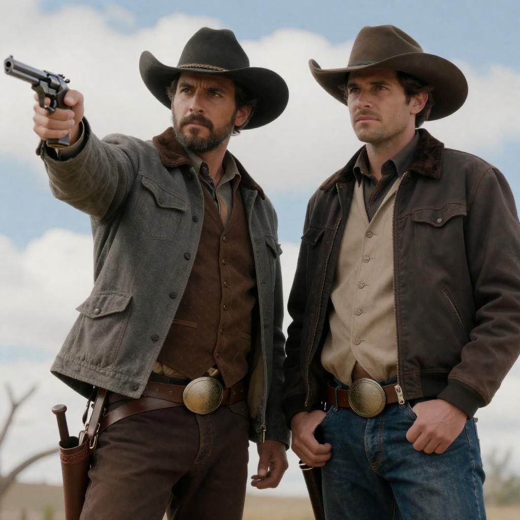 Two men in black cowboy hats and dark suits riding brown horses, outdoors with a wooden structure and trees in the background. Both men have beards and serious expressions. Sunlight highlights their faces.