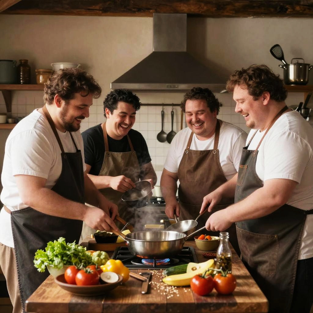 Four fat guys cooking together in a rustic kitchen, laughter and teamwork, various cooking utensils and fresh ingredients around, warm ambient light, rich textures, cozy and inviting