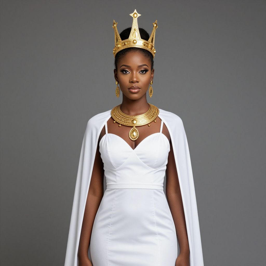 Photograph of a regal African woman with dark skin, wearing a white, strapless, satin dress with a white cape. She has a golden crown with pointed peaks and a star on top, and wears an elaborate gold necklace with a large pendant, and matching gold earrings. Her hair is styled in a sleek, low bun. She stands against a plain, gray background, exuding an air of royal elegance and confidence. The lighting is even, highlighting her jewelry and the texture of her dress.