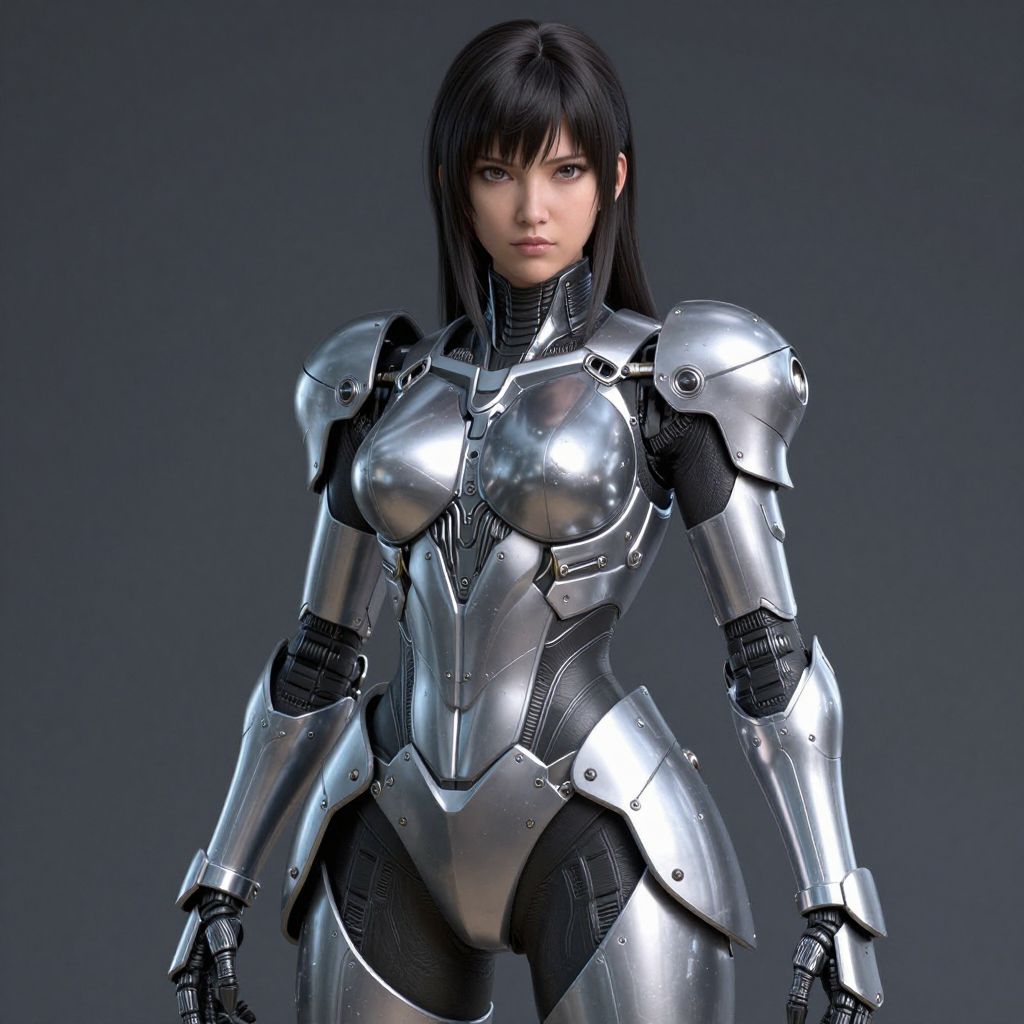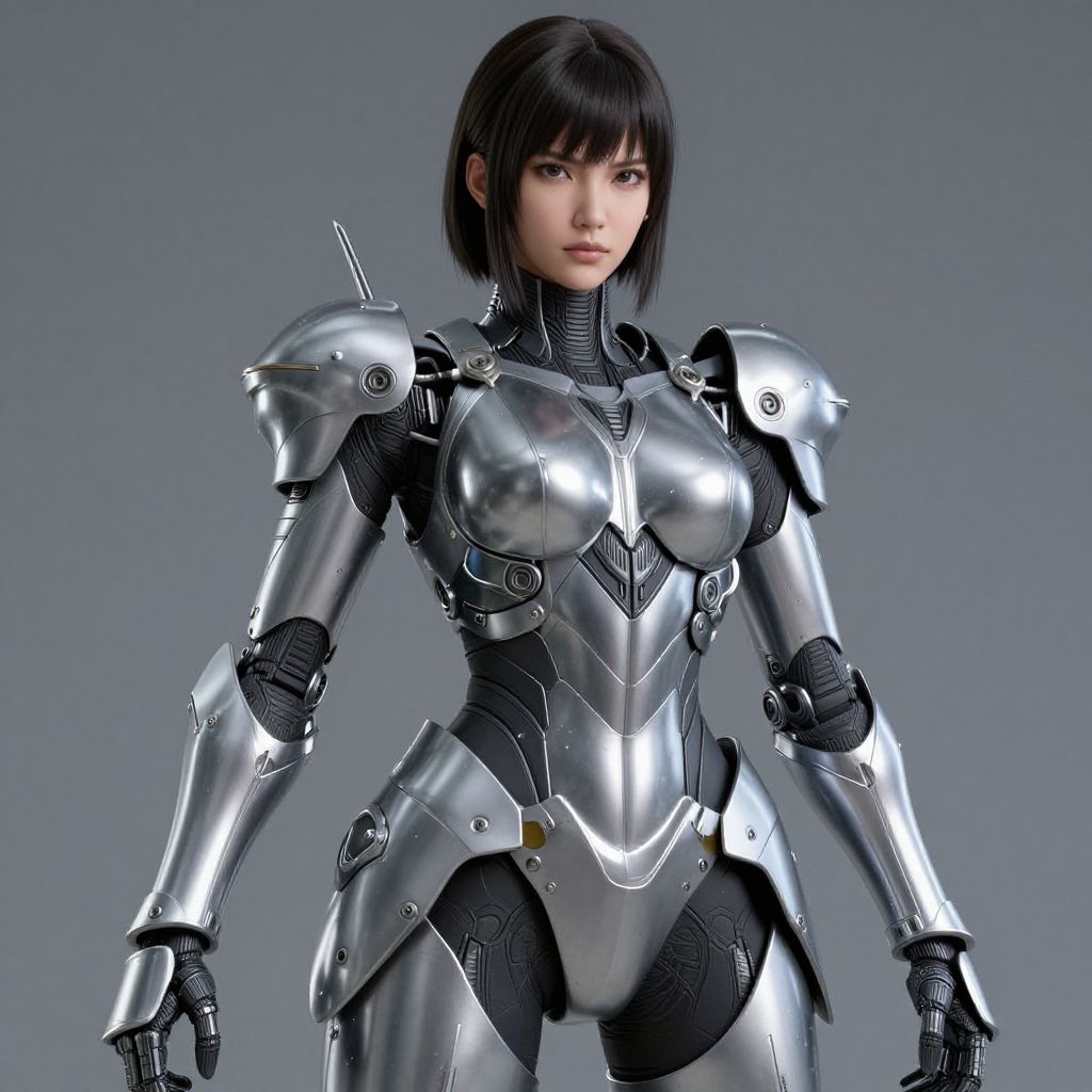 CGI image of a beautiful, young Asian woman in shiny, futuristic silver armor with black accents, standing against a dark blue background.