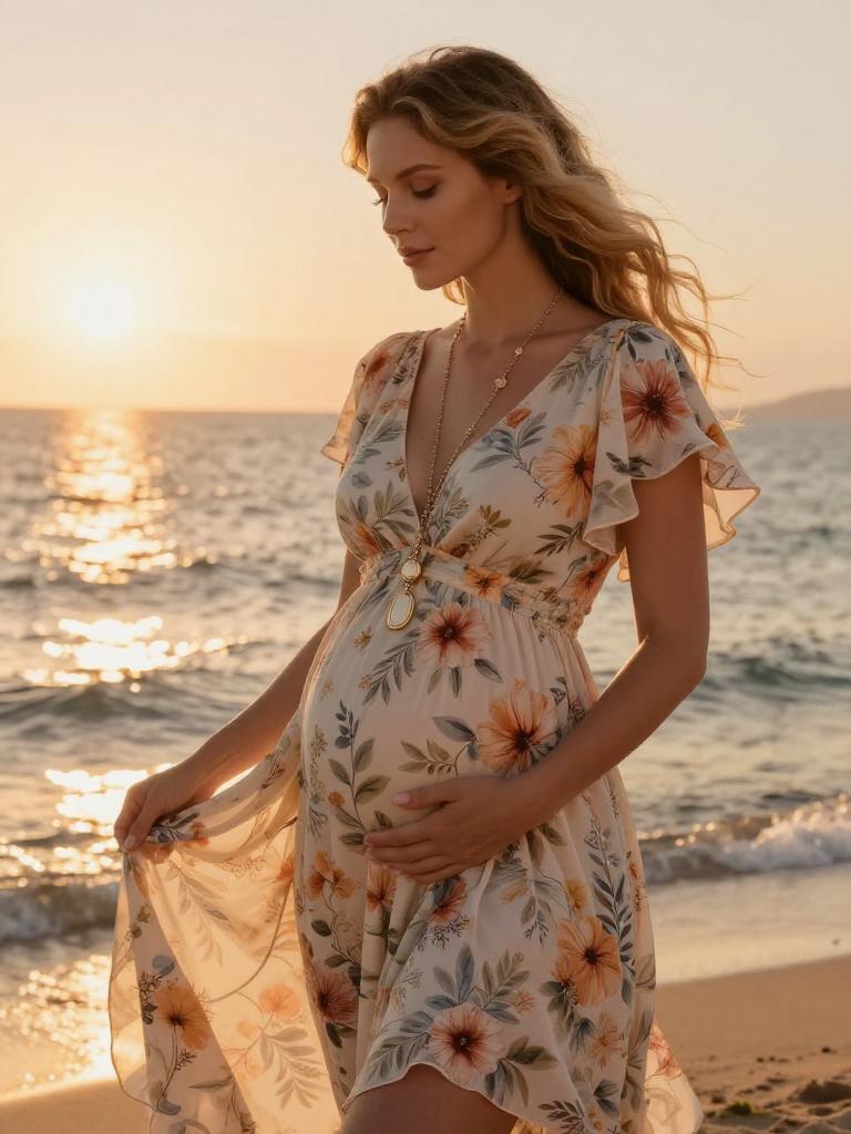 Pregnant fashion outfit, radiant expecting woman standing in the mountain during golden hour, wearing soft blush wrap maternity dress with ruffled hem with drop earrings with sparkling crystals and a thin gold bangle, loose sandy blonde hair with natural beachy texture hair gently moving in the breeze, posed standing in profile, hands resting on her bump, eyes closed in peaceful expression along the shoreline, soft warm sunlight illuminating her glowing skin and highlighting the fabric details, warm orange and yellow tones reflecting on the water, romantic and serene atmosphere, high-end maternity fashion photography, ultra-detailed