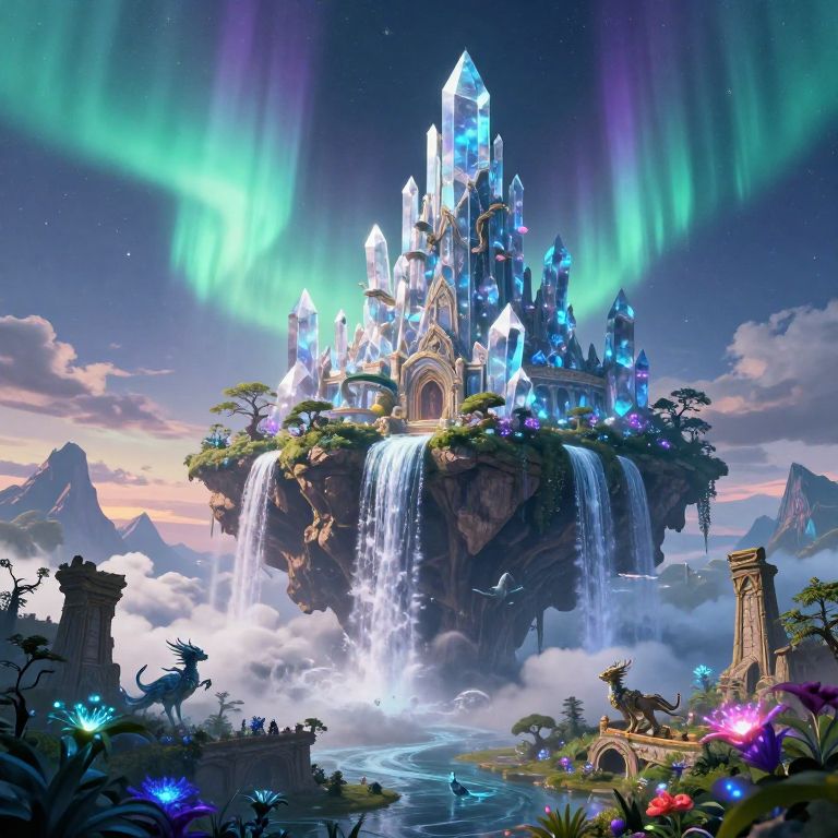 Noe, a fantasy landscape featuring a towering crystal fortress on a floating island amid vibrant auroras, ethereal waterfalls cascading into clouds, lush bioluminescent flora illuminating the surroundings, with mythical creatures wandering ancient ruins beneath a twilight sky.