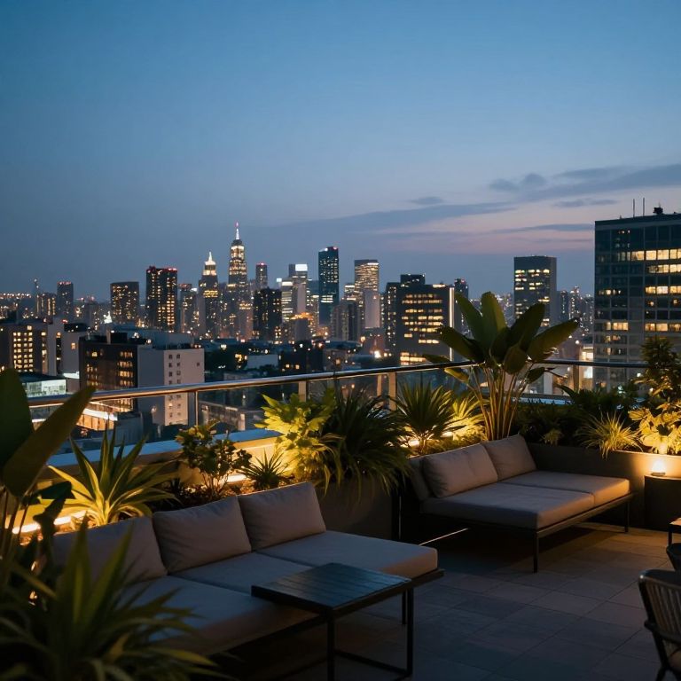 City lights aesthetic portraying a serene evening rooftop scene, glowing cityscape stretching into the distance, soft ambient lighting highlighting plants and lounge furniture, combining urban energy with peaceful retreat vibes.