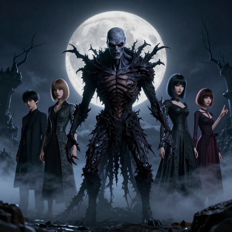 Full shot portrait of angry darkness creature at moonlight, inspired by tim burton, norihiro yagi, marc simonetti, amano, juri misaki, giger, detailed, unreal engine 4k volumetric light, fog,