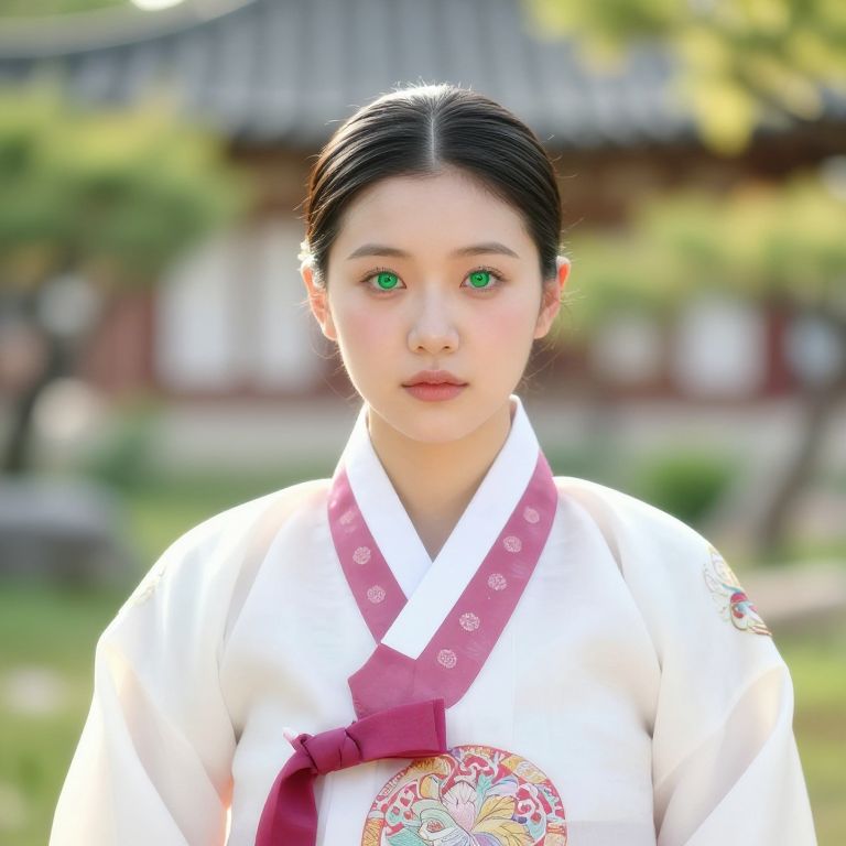 Portrait of a Korean with green eyes wearing traditional hanbok in a serene garden, soft morning light highlighting intricate embroidery and natural beauty, photorealistic style
