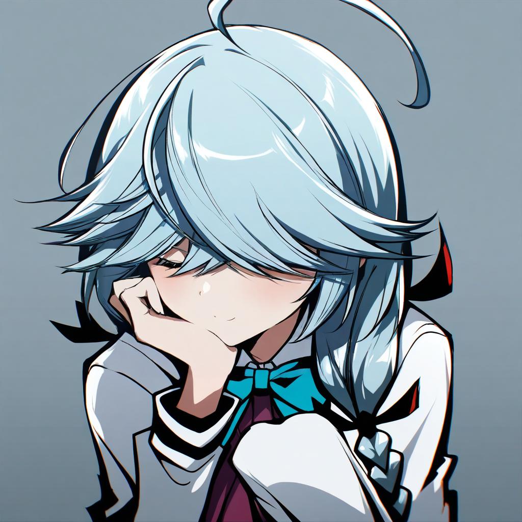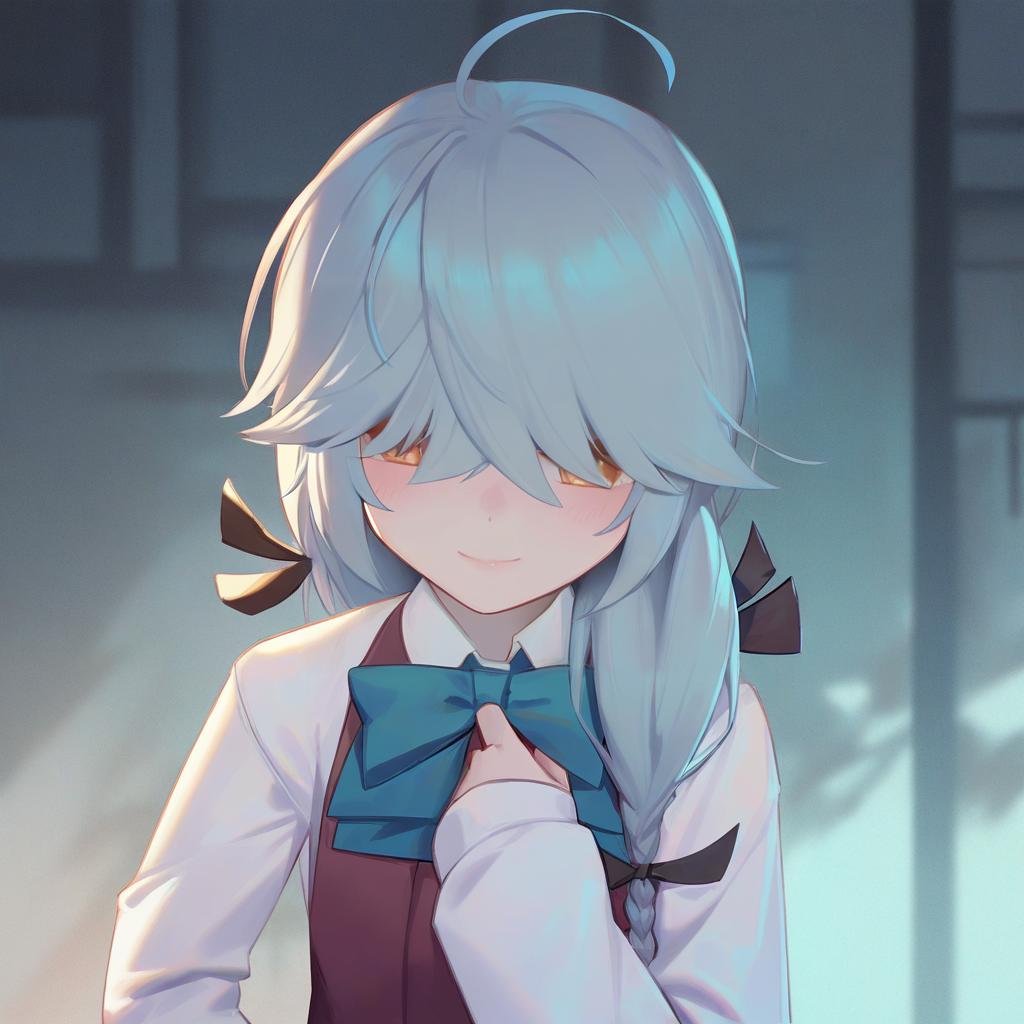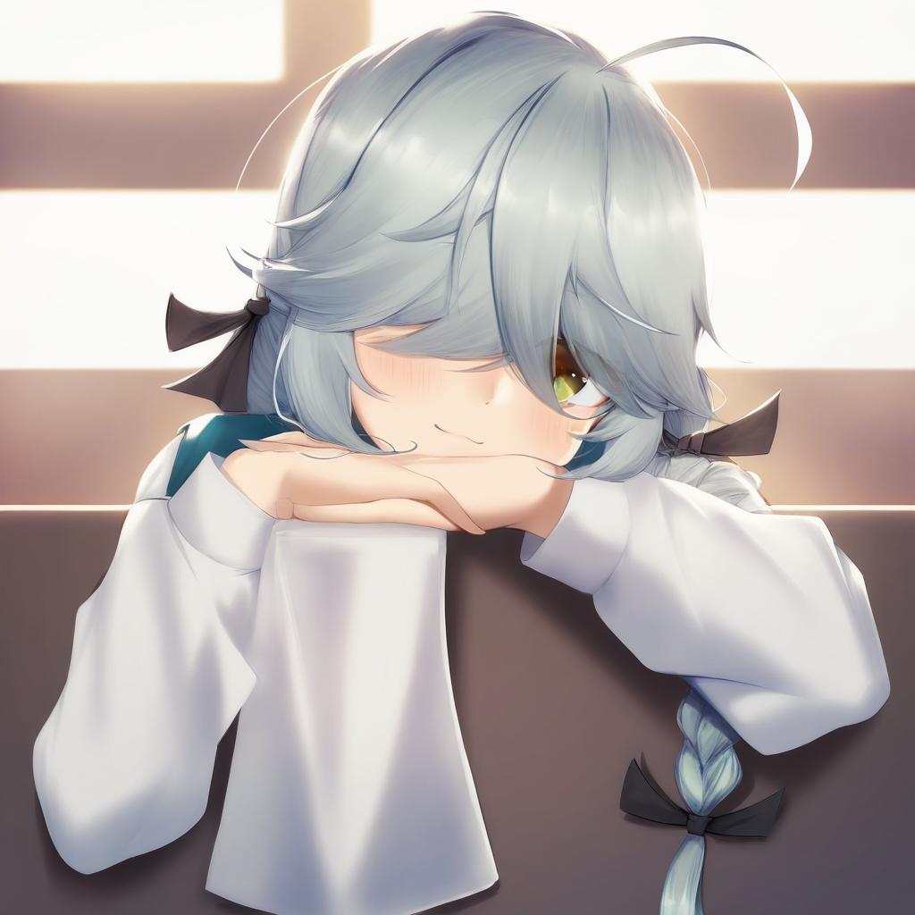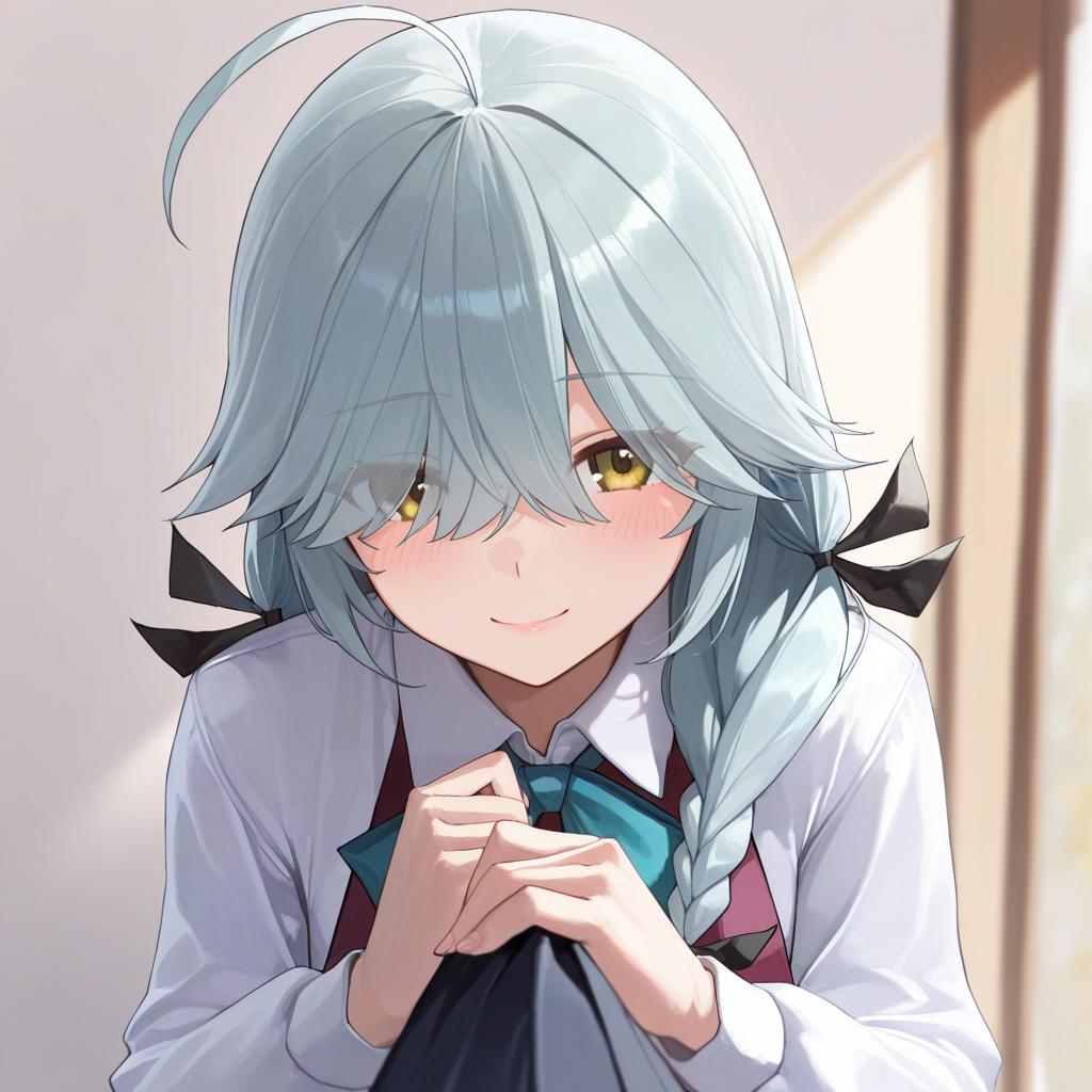 Hamanami (kancolle), kantai collection, 1girl, hair over eyes, brown eyes, hair over one eye, long hair, grey hair, single braid, ahoge, hair ribbon, school uniform, white shirt, school uniform, long sleeves, black ribbon, by artist sasucchi95, leet