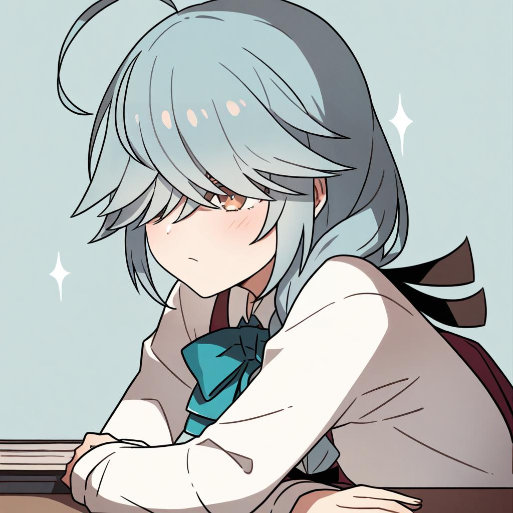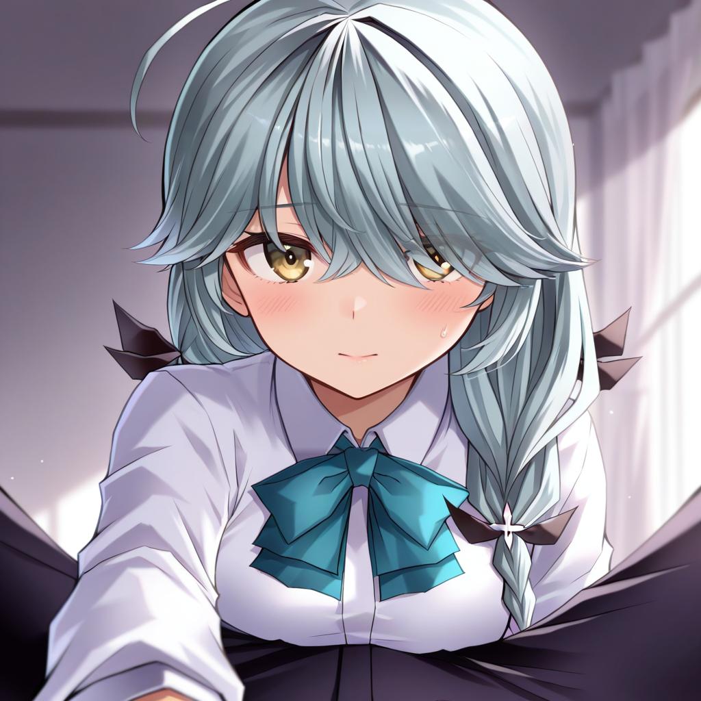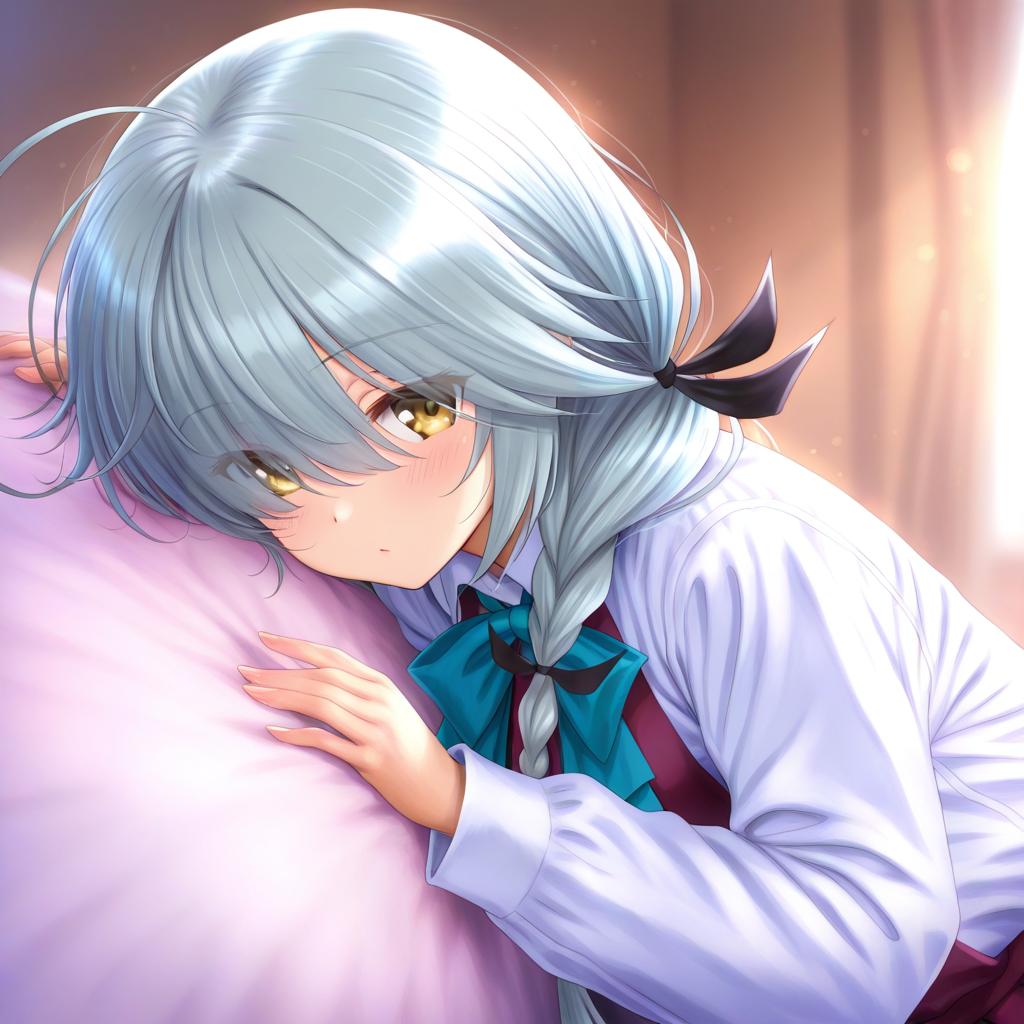 Digital illustration of a shy anime girl from Kantai Collection (Kancolle) with long grey hair styled in a single braid and an ahoge. She wears a white long-sleeve school uniform shirt with a teal bow tie and a black hair ribbon, partially covering her brown eyes and face. The background features a light blue circle on a pale blue backdrop.
