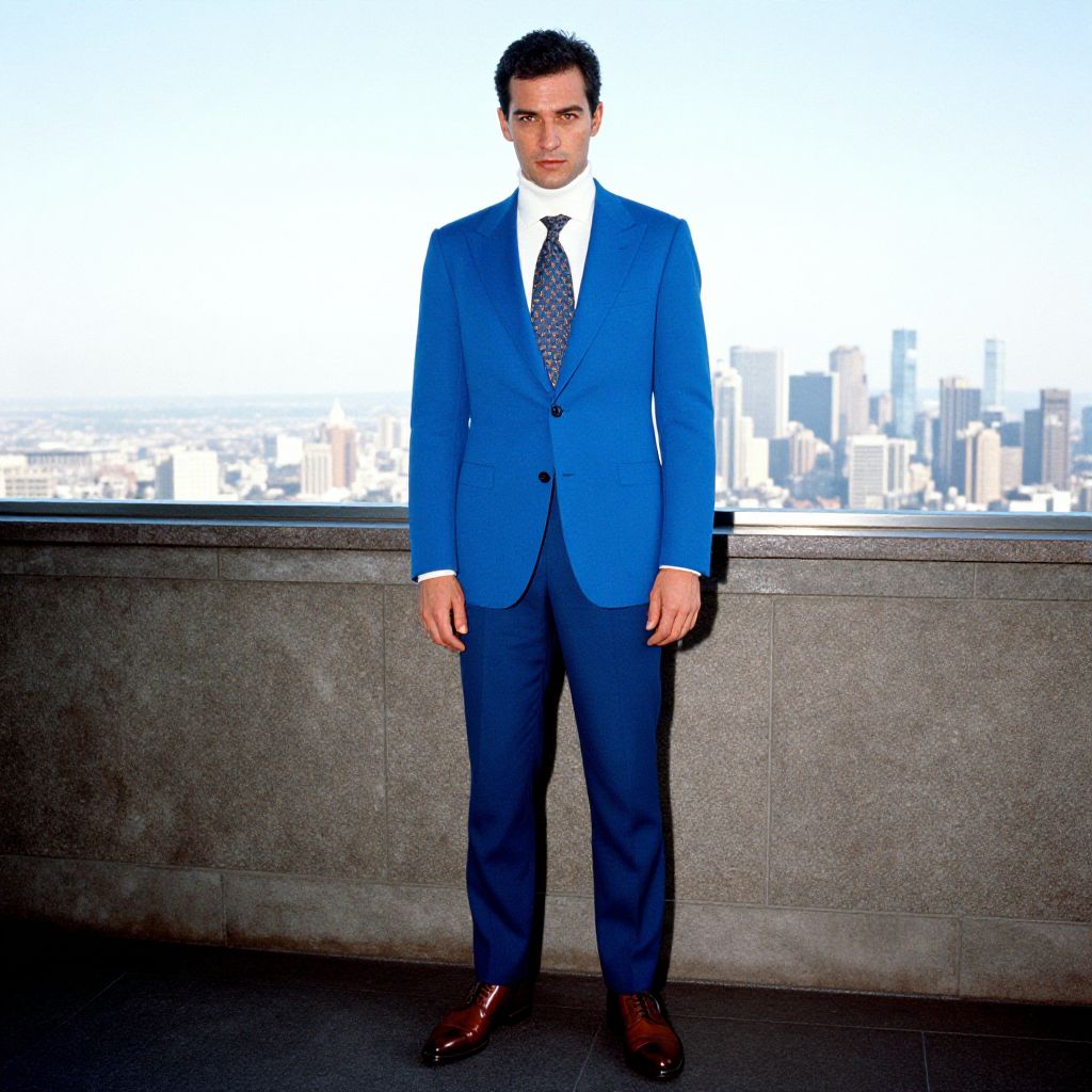 Photograph of a tall, dark-haired man standing confidently on a rooftop with a city skyline in the background. He wears a bright blue suit with a white dress shirt and a patterned tie. His brown leather shoes are polished, and he stands with his hands by his sides. The rooftop has a gray, textured concrete wall behind him, and the sky is clear with bright sunlight. The man's expression is serious, and the image has a high-contrast, slightly over-saturated style, emphasizing the vivid blue of his suit.