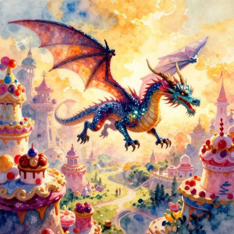 Envision an enchanting scene reminiscent of impressionist watercolor paintings, capturing a magnificent dragon gliding above a whimsical fairy-tale landscape from a bird's-eye perspective. Observe the vivid colors and dreamlike quality as the dragon navigates between towering structures made of confectionery delights, its scales glistening with mesmerizing hues reflecting the warm glow of golden hour light. The composition evokes a sense of awe and wonder, delicately portraying the ethereal grace of this fantastical encounter while employing bold, expressive brushstrokes to create an atmosphere of enchantment and joy.
