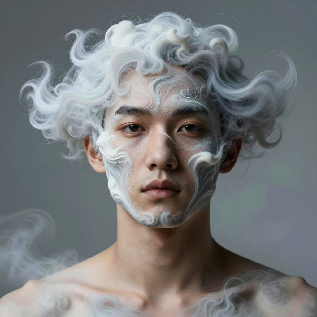 Side profile of an Asian man with short black hair creatively edited to show delicate trees growing from his hair, symbolizing a surreal blend of human and nature. The background is plain white, emphasizing the conceptual artistic fusion.