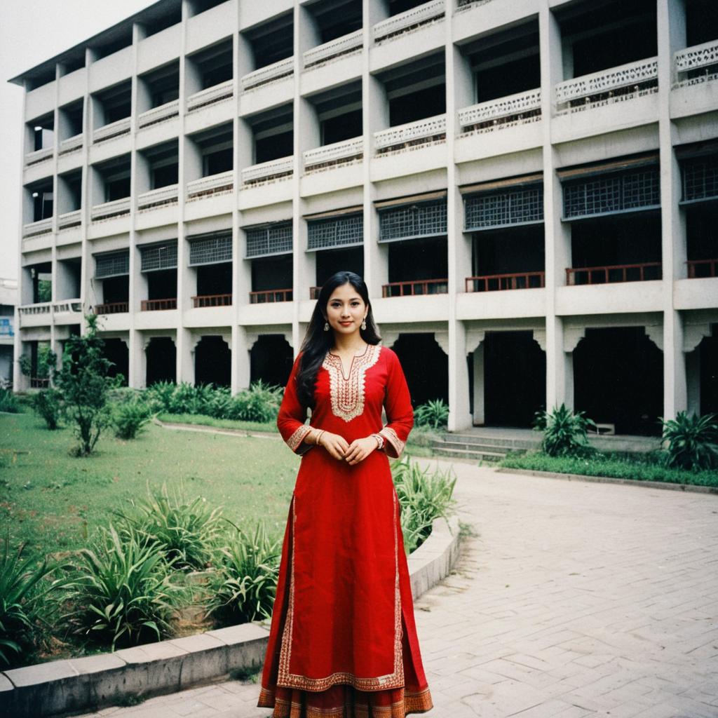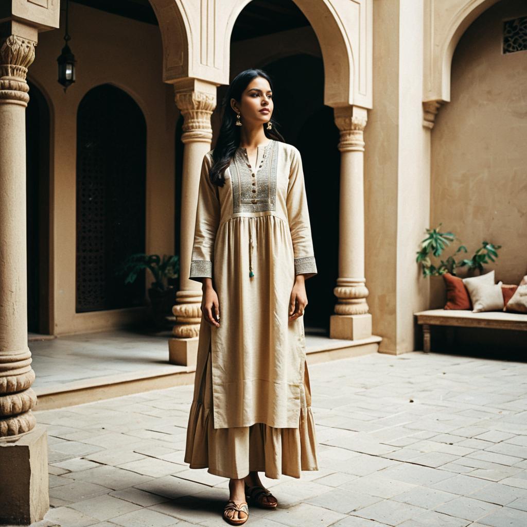 Stylish Kurta Woman, a woman standing in front of a building wearing a beige dress