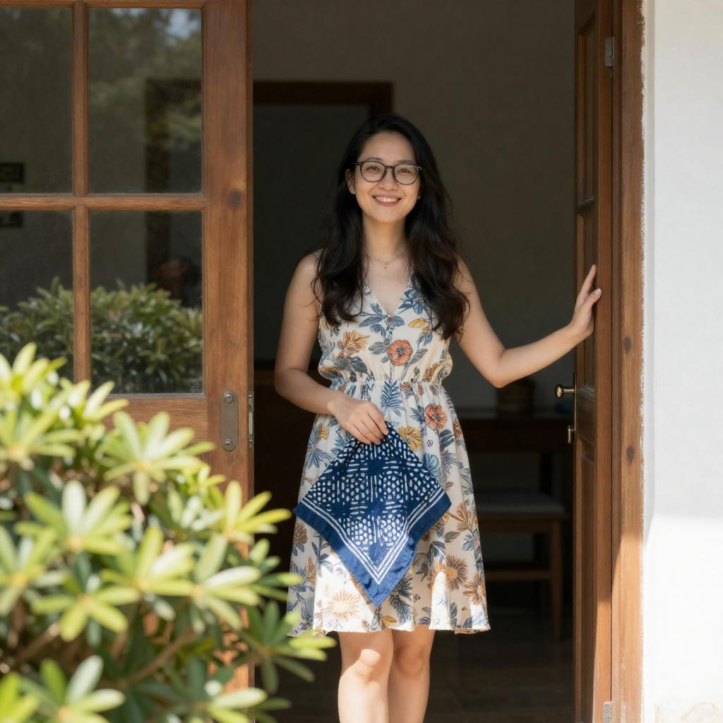 Woman with long dark hair, glasses, and floral dress stands in open wooden door, holding blue patterned cloth in left hand, right arm extended to doorframe. Bright sunlight, green shrubs in foreground, interior dimly lit. Smiling.