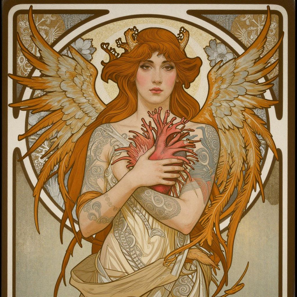 This is a digital illustration in a vintage Art Nouveau style. It depicts a fair-skinned woman with long, wavy auburn hair and delicate features, wearing a golden, lace-trimmed gown. She has large, ornate wings with orange and white feathers, and a small crown on her head. She holds a heart with pink feathers in her hands, positioned just below her chest. Her arms are adorned with intricate, grey tattoos. The background features a circular, halo-like design with floral patterns and a muted, gold-toned gradient. The overall image has a warm, soft color palette and intricate detailing.