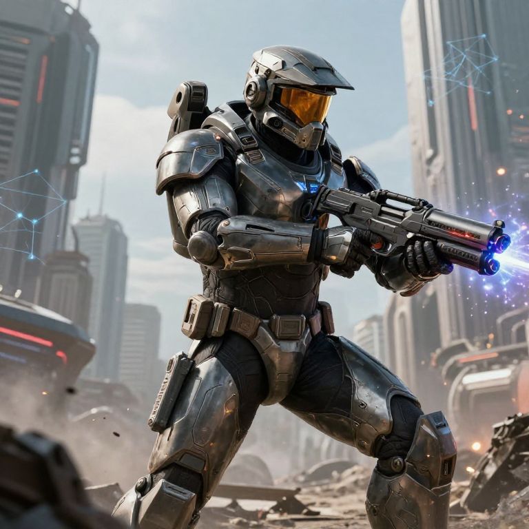 Master Chief AI art portraying a dynamic action scene with the armored warrior wielding an energy weapon, advanced mechanized exosuit textures, set against a sprawling futuristic city under siege, blending AI neural network visuals with sci-fi realism.
