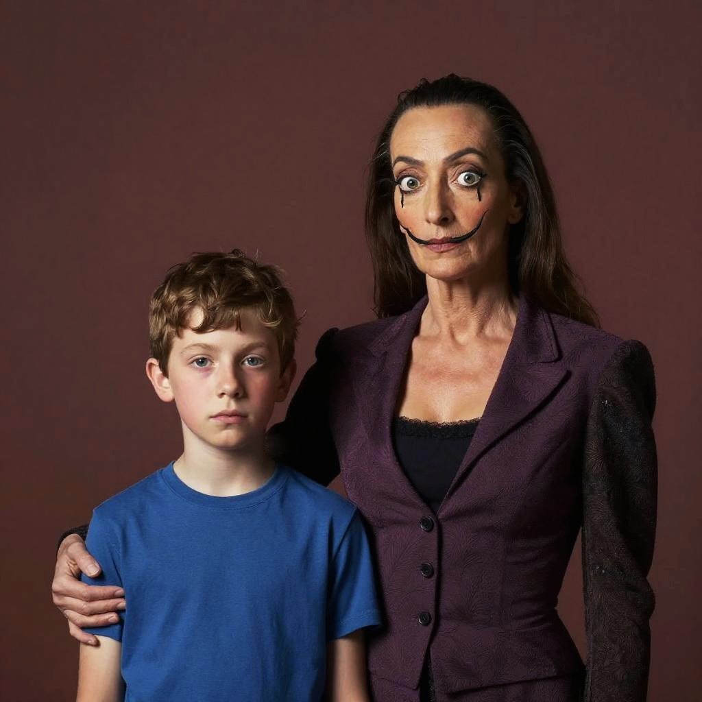 Realistic photo.A family portrait of a mother with a son in a surreal art style inspired by Salvador Dalí, René Magritte. realistic photo