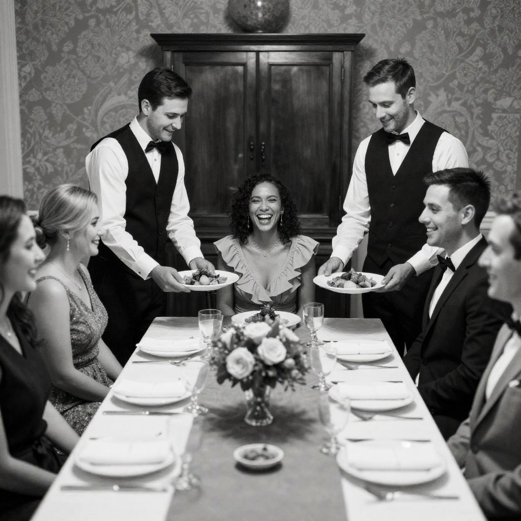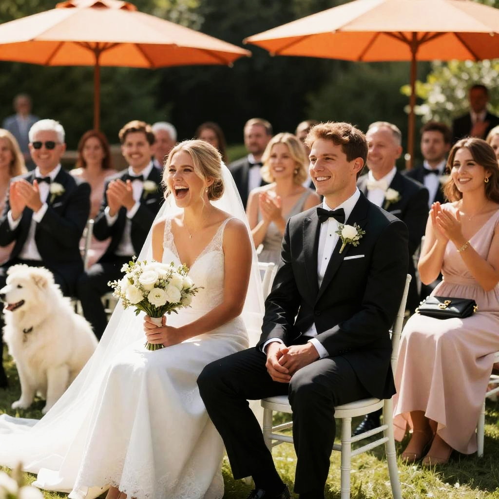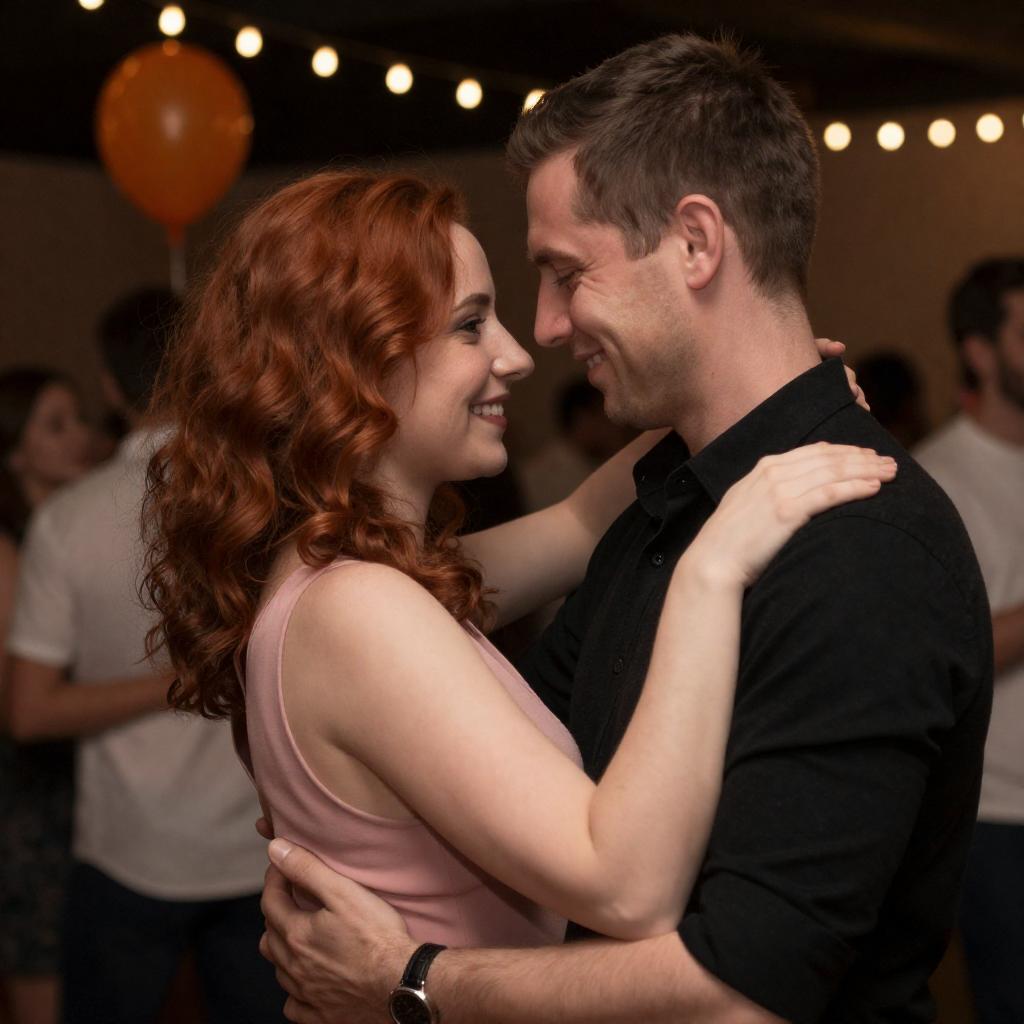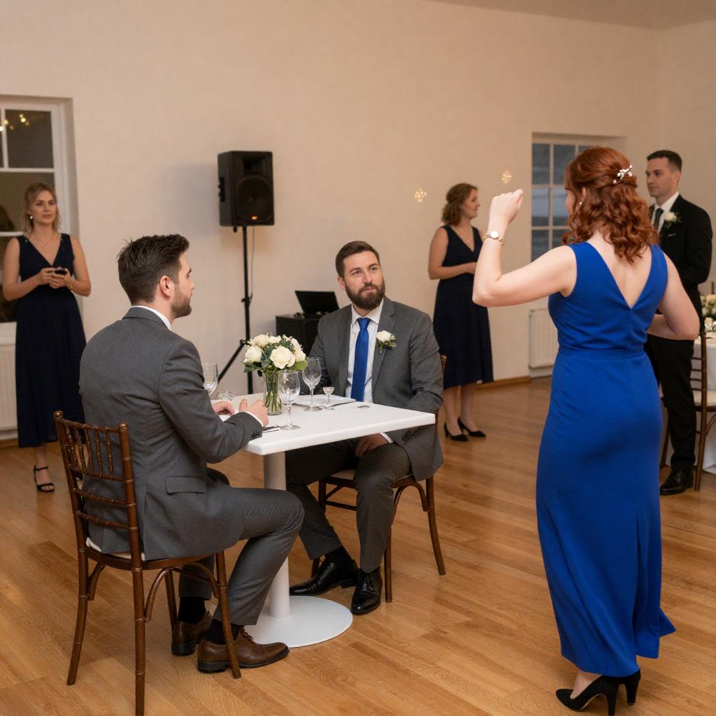 Photograph of a wooden-floored wedding reception. Three men and two women, dressed in formal attire, interact. One man with dark hair and beard, in a gray suit, sits at a table with glassware and flowers. A red-haired woman in a blue dress dances. Background includes other guests, a speaker, and star-shaped decorations. Warm lighting.