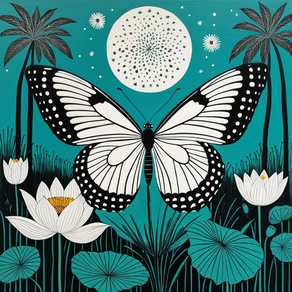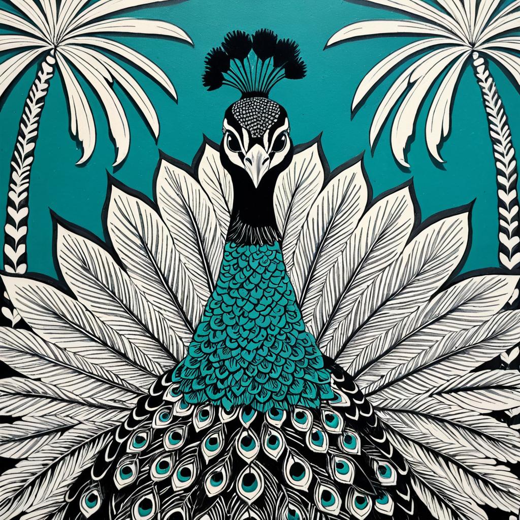 An oil painting of a mystical jaguar resting on jungle vines, created in the Gond folk art style. The artwork features monochrome teal colors with decorative elements including palm trees and floral motifs in the background. The jaguar is depicted with black and white patterns and teal eyes, combining abstract brush strokes and line art inspired by Paul Klee.