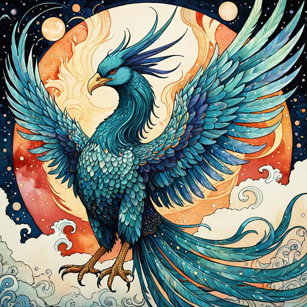 Illustration of a majestic phoenix with outstretched wings set against a dramatic sky filled with clouds and a glowing sun. Rendered in a style inspired by Alphonse Mucha with Renaissance-style lighting and intricate details in feathers and background elements.