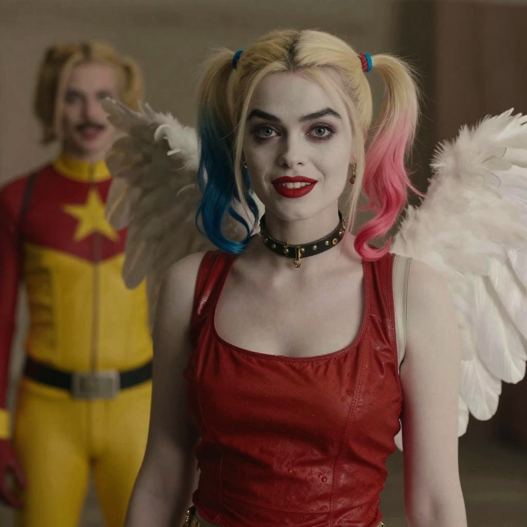 Movie still, film still, cinematic, cinematic shot, a woman with red lipstick and a red dress is looking at the camera, harley quinn, kubrick stare, wearing red and yellow hero suit, 8k, angel, full color still, sebastian kruger