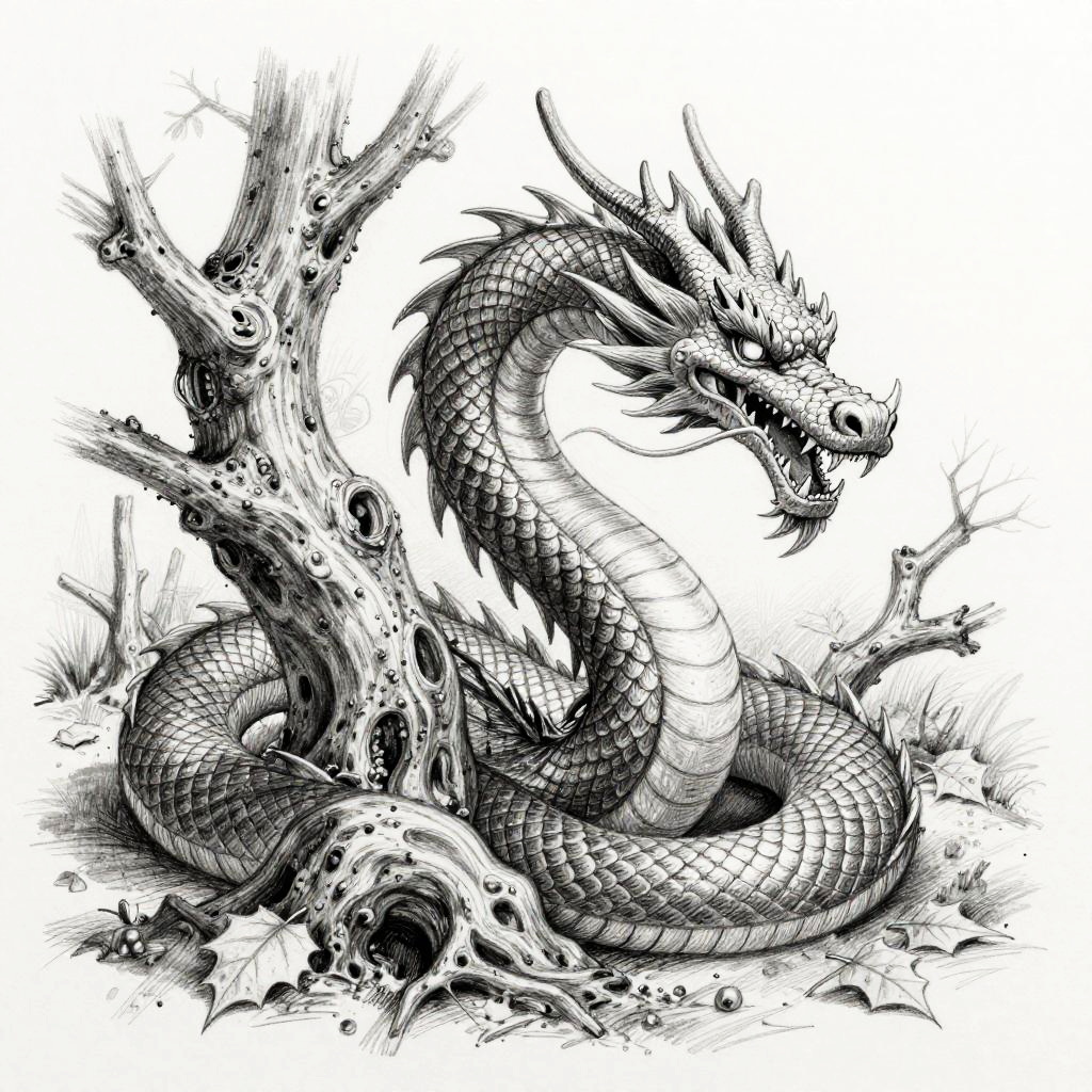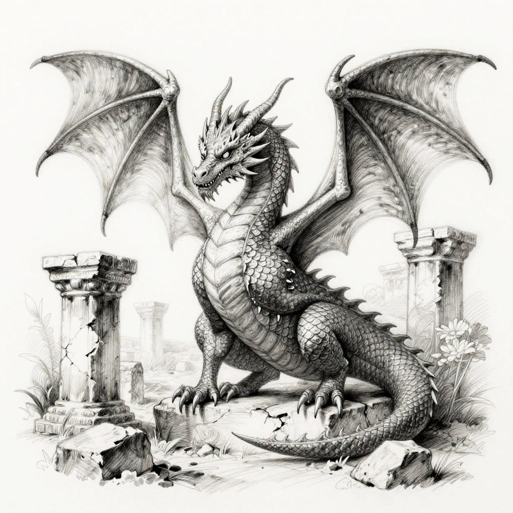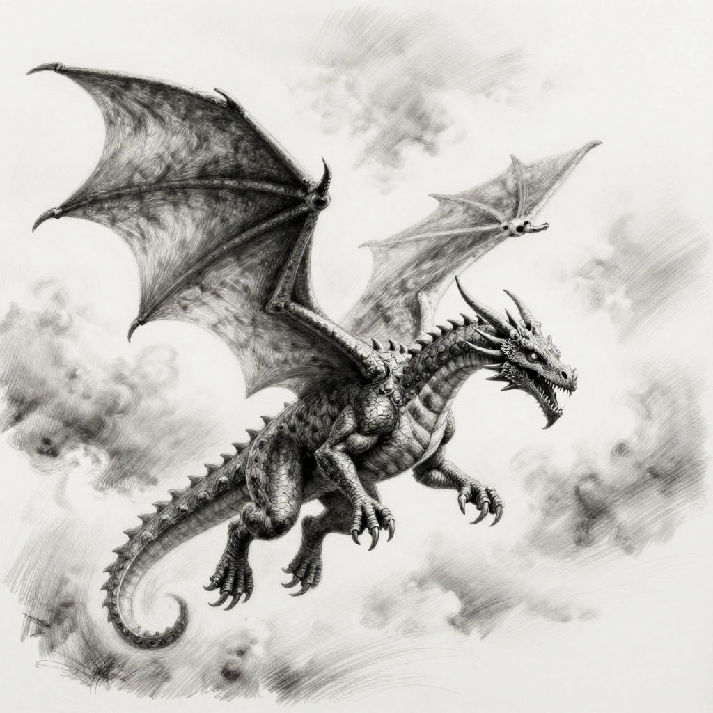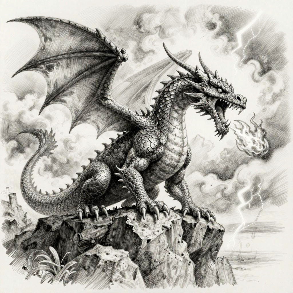 Pencil dragon sketch of a young dragon perched on a rocky outcrop, delicate pencil strokes emphasizing texture of scales and smoke curling from nostrils, dynamic pose with finely detailed wings spread wide against a misty mountain backdrop.