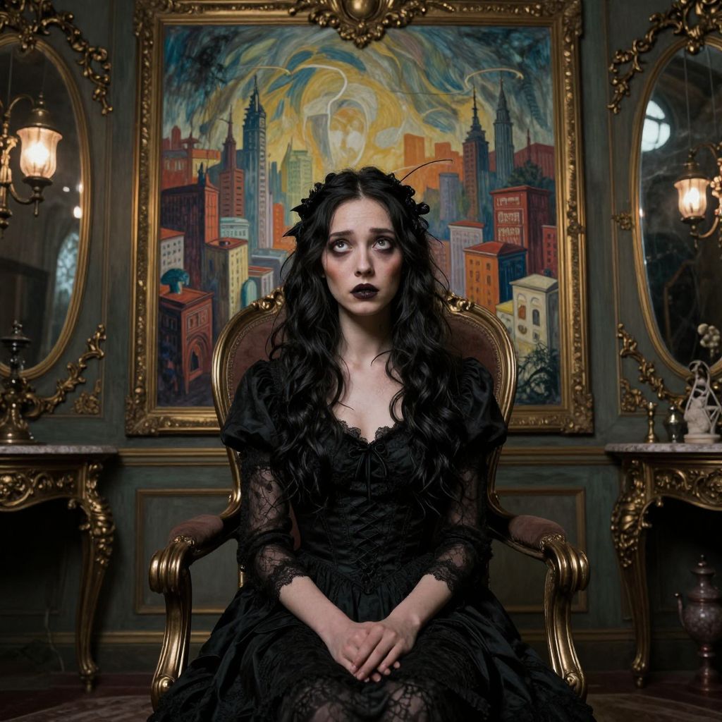 Gothic woman with long black hair, dark makeup, lace dress, seated in ornate chair, stares at Van Gogh-style cityscape painting
