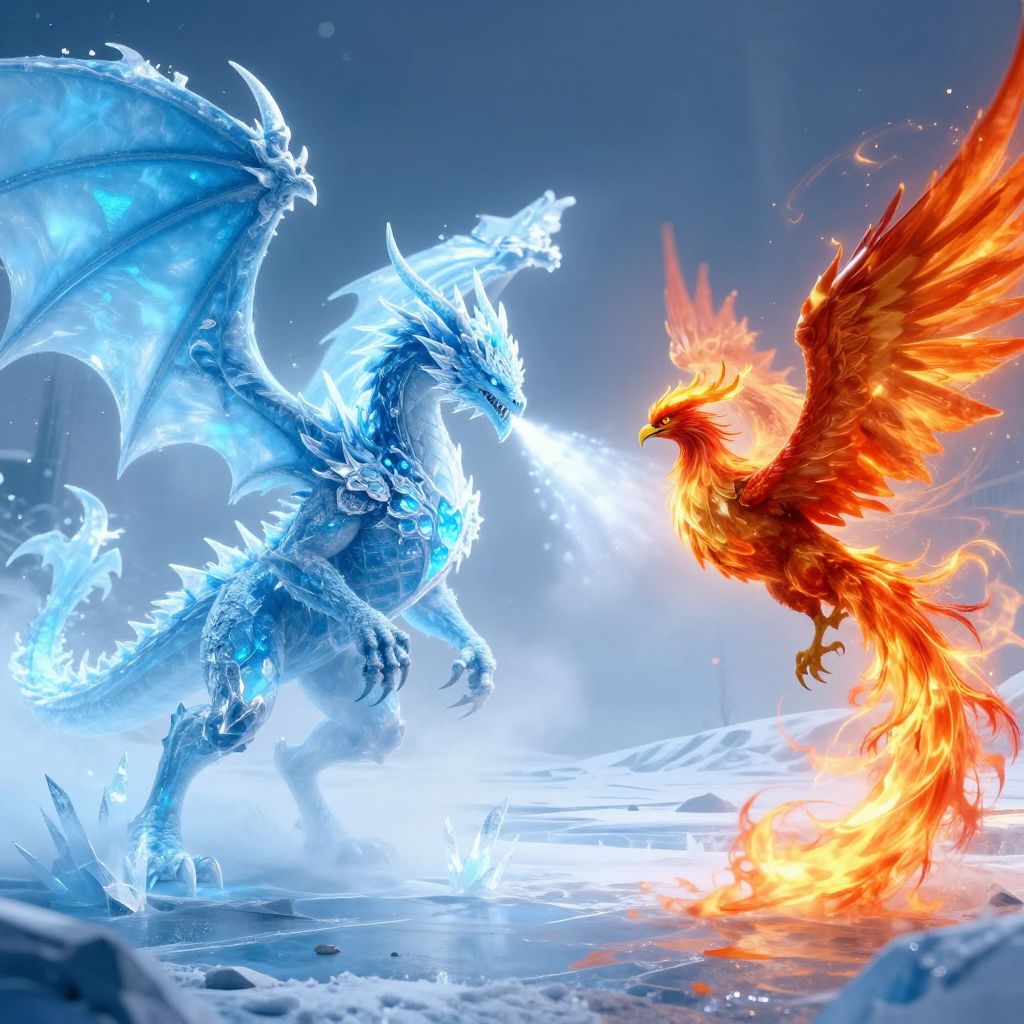 Digital artwork of a fierce blue ice dragon facing a blazing red phoenix in a snowy, icy landscape. Bright contrast of colors and intense energy.