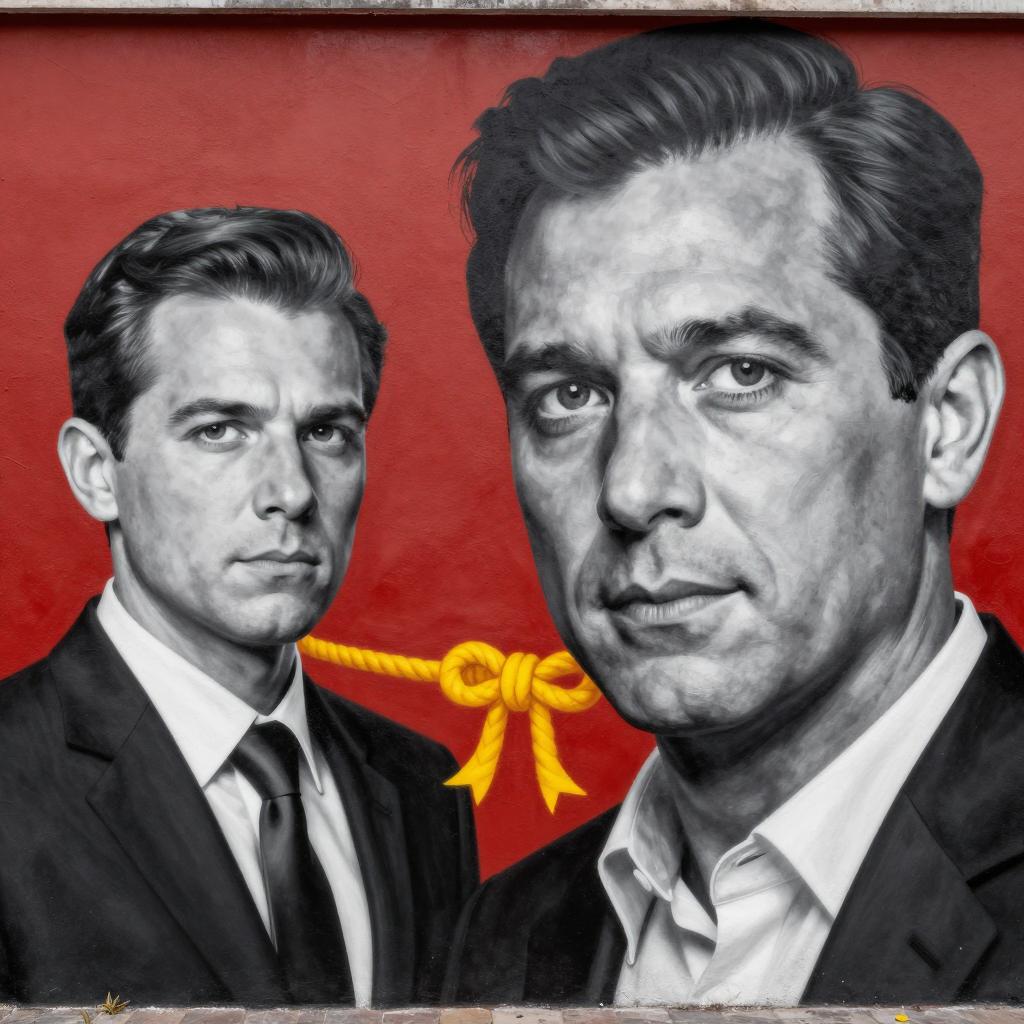 Black-and-white mural on red background. Two men: smaller man in suit with serious expression, larger man's face in close-up. Yellow rope with bow tied between them. Larger man's face on right, smaller man on left.