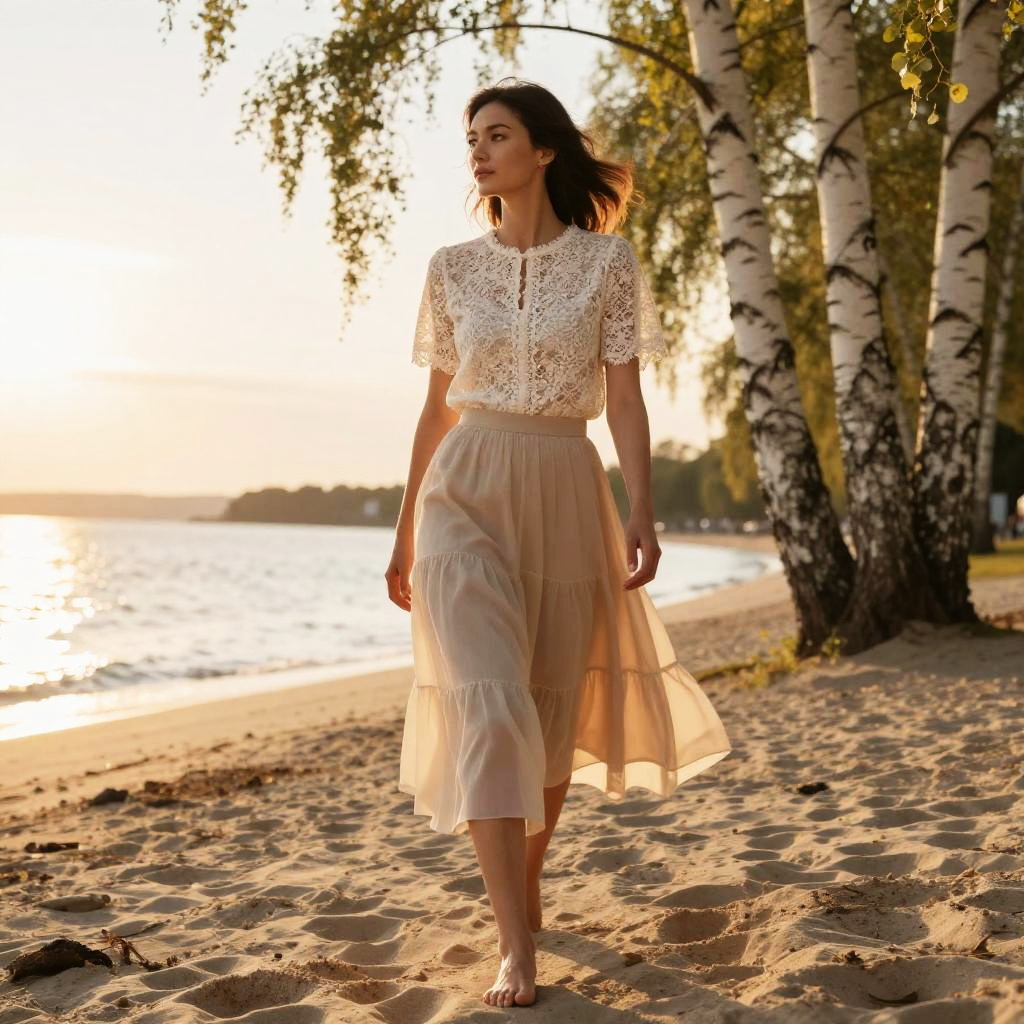 A woman walks gracefully along a sandy beach lined with birch trees, bathed in the warm glow of a setting sun. She wears an elegant lace blouse paired with a layered skirt, creating a serene and stylish scene in golden hour light.