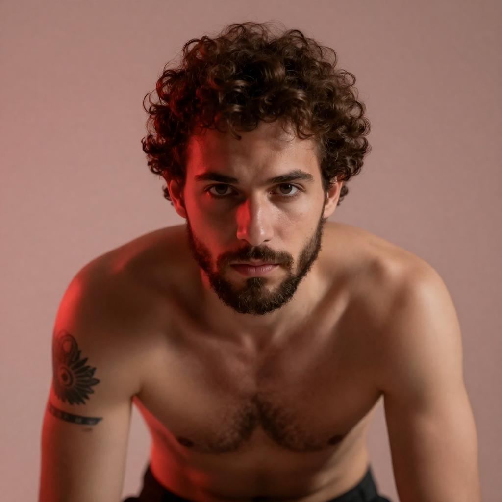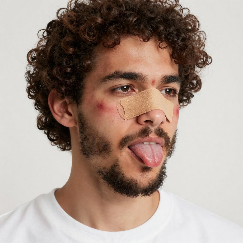 Photograph of a curly-haired, bearded man with a light brown bandage on his nose, sticking out his tongue. He has red marks on his cheeks and forehead. He wears a white shirt, looking to the right with a slight frown. Bright, white background.