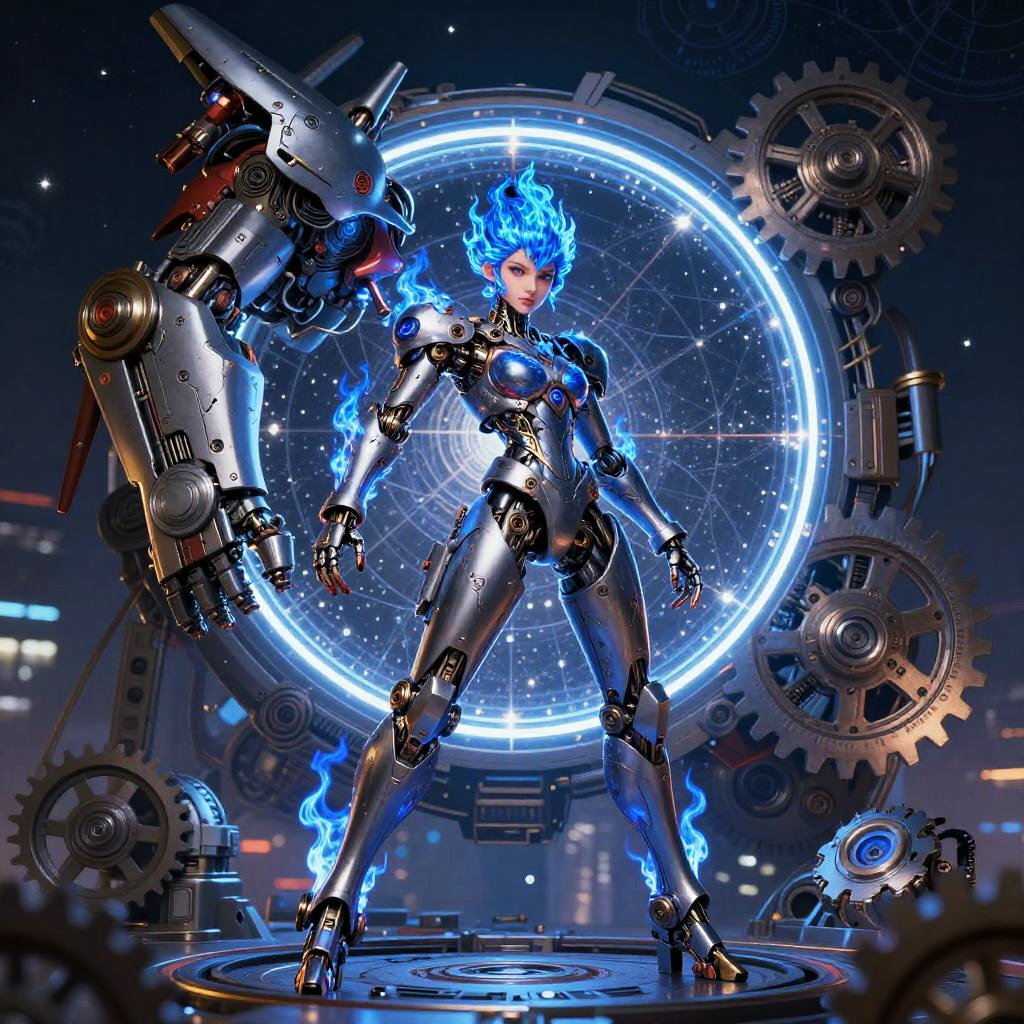 At night, huge and complex technical background, (masterpiece), (detailed), (intricate details), (realistic, photo-realistic:1.37), illustration, an extremely delicate and beautiful, 8k wallpaper, absurdres, incredibly absurdres, ultra-detailed, highres, extremely detailed, beautiful detailed girl, extremely detailed eyes and face, beautiful detailed eyes, 1girl, solo, (full body:1.3), blue fire, gear, giant robot, machine, damage armor, glove, machinery suit, (machinery boots), Mecha, science fit, updo, wearing mechanical equipment, Standing posture of model, Twist your body slightly, (Tall and elegant, slender figure:1.4), (behind the luminous disc:1.2), (The background is a star map:1.5), Dance posture, Sexy posture, Tall and elegant, Metal Takazawa, Gorgeous, Science Filament, (Red and black color case:1.3)