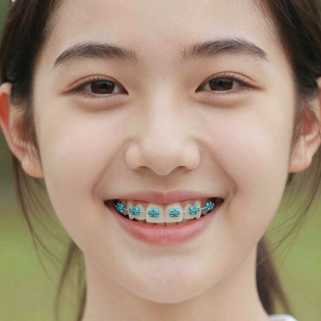 Portrait of a happy teenager with cute light blue braces, bright eyes, flawless skin, natural daylight, subtle makeup, vibrant and youthful energy, high-resolution dental close-up