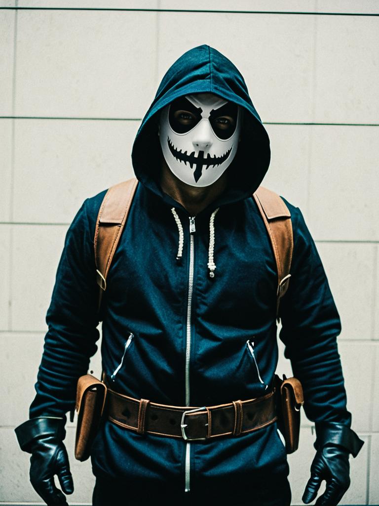 Man in Robber costume, cosplay editorial photography, realistic tones