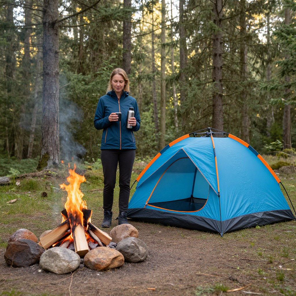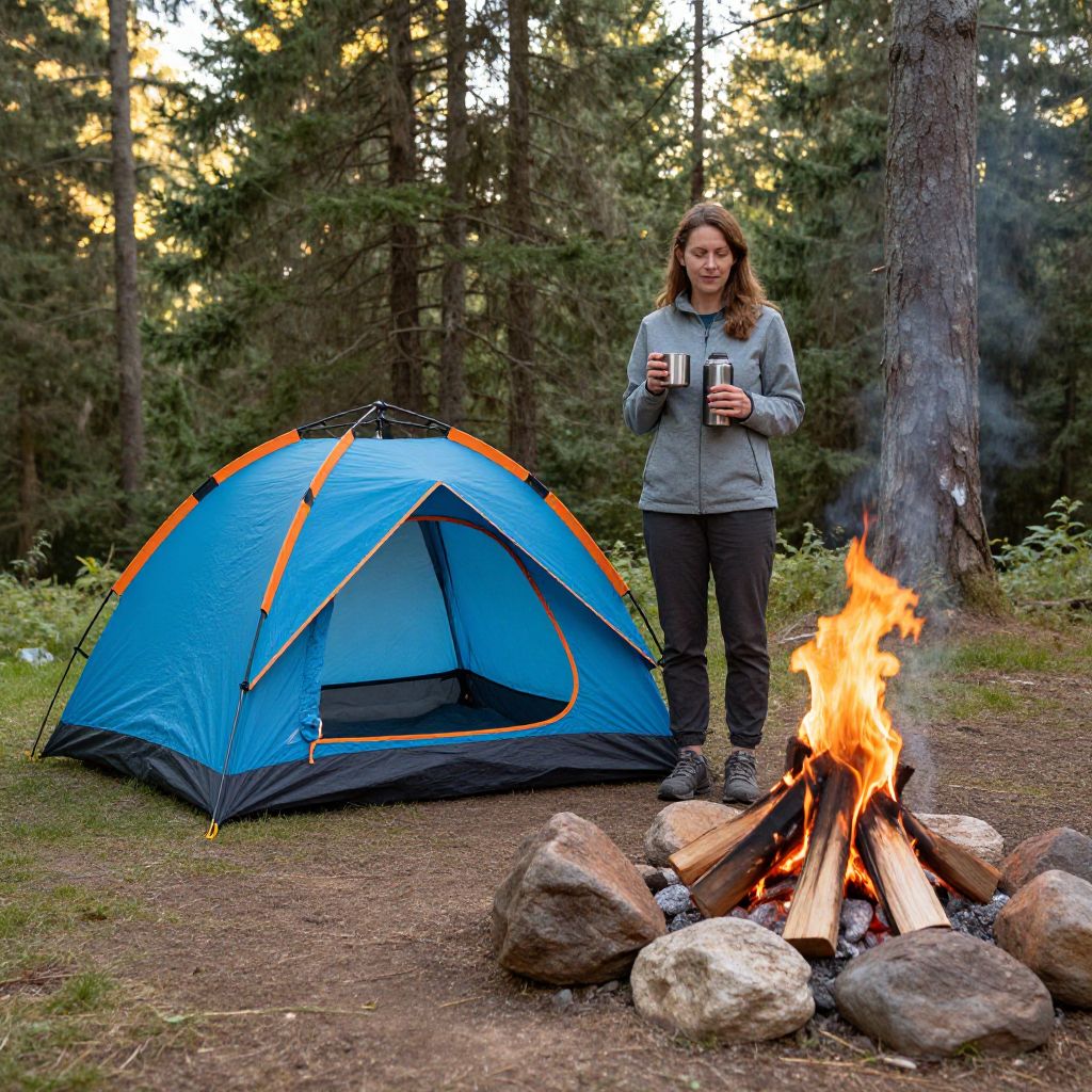 Camping scene featuring a woman standing beside a vibrant blue tent with orange trim, holding a cup and thermos, while a crackling campfire burns brightly in front, surrounded by rocks and logs, set against a serene forest backdrop with sunlight filtering through tall evergreen trees.