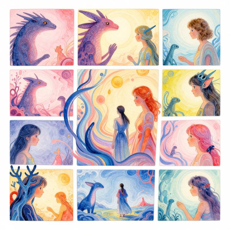 This is a vibrant, watercolor-style digital illustration featuring 12 small panels depicting interactions between fantastical creatures and humans. The creatures are dragon-like with purple and blue hues, while the humans are diverse, with one having curly brown hair and another with long red hair. The background colors vary from soft pinks and yellows to blues and greens, creating a whimsical, ethereal atmosphere. The creatures have elongated tails and horns, and the humans wear flowing, ethereal dresses. The panels show various poses and interactions, including the creatures offering gifts and humans reaching out. The art style is whimsical and dreamlike, with fluid, swirling lines and soft, pastel colors.