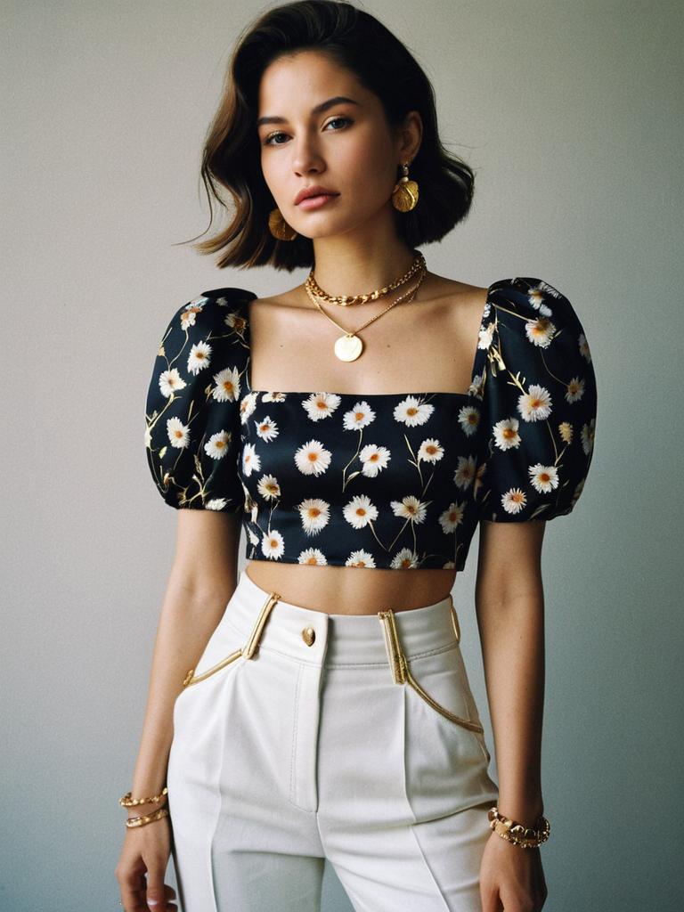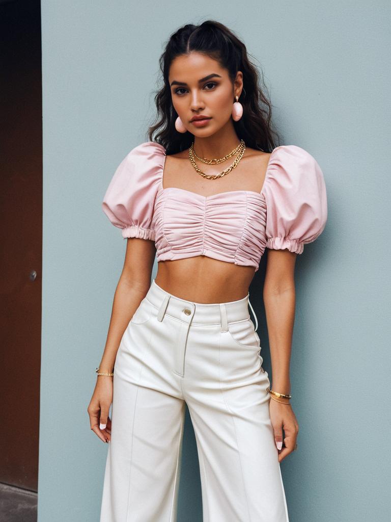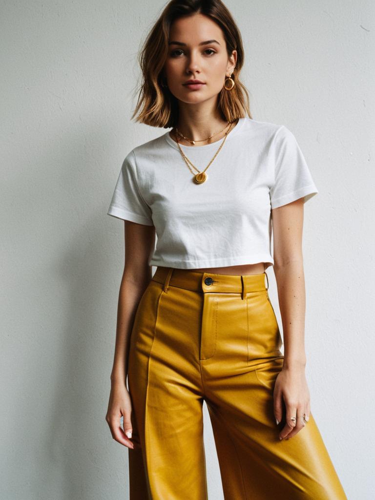 Woman, trendy fashion, silky red wrap blouse with balloon sleeves, high-waisted tan leather pants, leather-like material, thin layered gold necklaces.