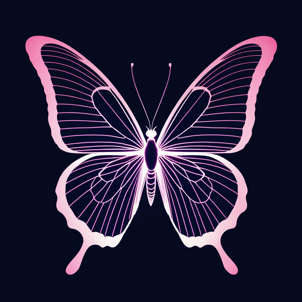 Pink butterfly-shaped light painting with a futuristic elegance set against a midnight blue. The artwork features soft, glowing pink hues and graceful curves, creating an ethereal ambiance. Styled with high-contrast and a contemporary art approach, the scene exudes a tranquil and serene feel. Ultra-detailed and rendered in a digital masterpiece quality, the composition showcases modern artistic expression with captivating visual harmony and artistic illumination.