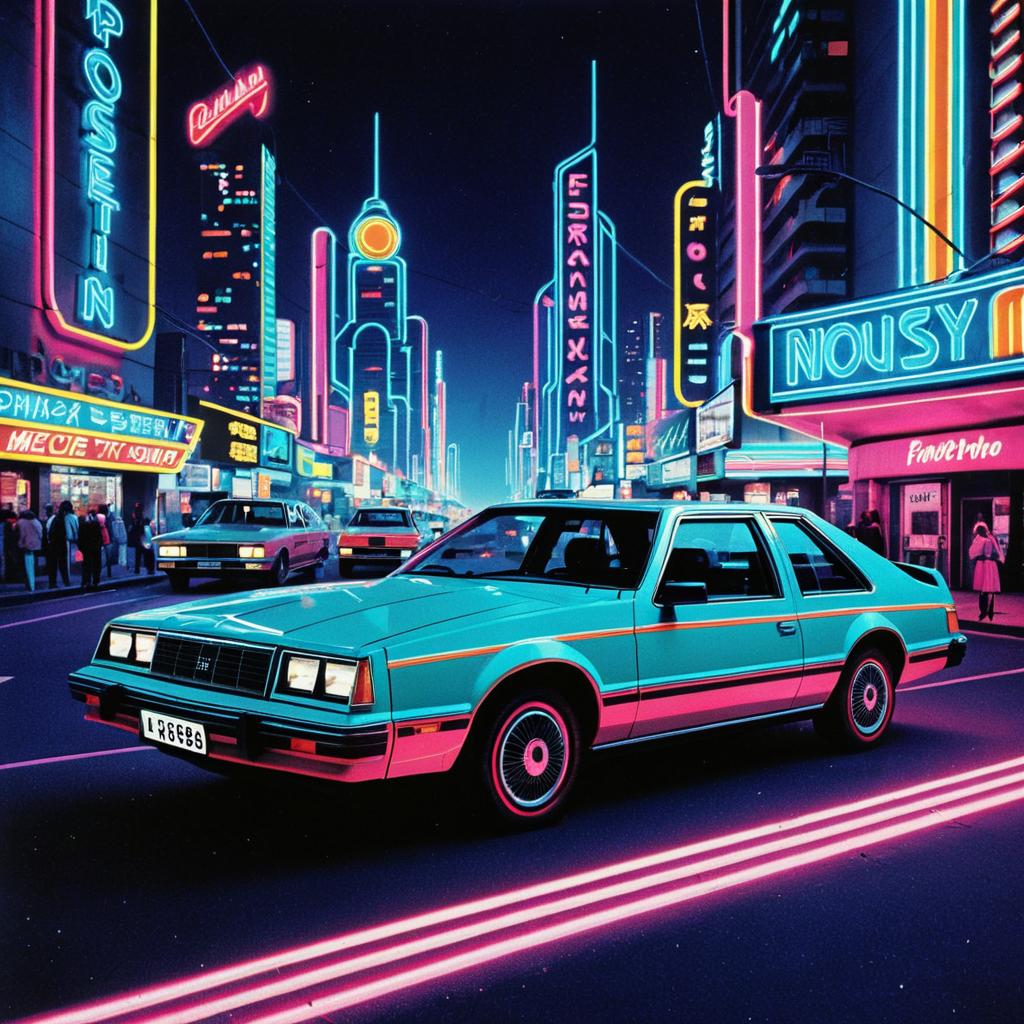 A retro-futurism style image featuring a bright orange 1980s car parked in the middle of a neon-lit city street. The background displays tall skyscrapers with neon signs in vibrant colors like pink, blue, and yellow, evoking a futuristic yet vintage 1980s urban atmosphere.