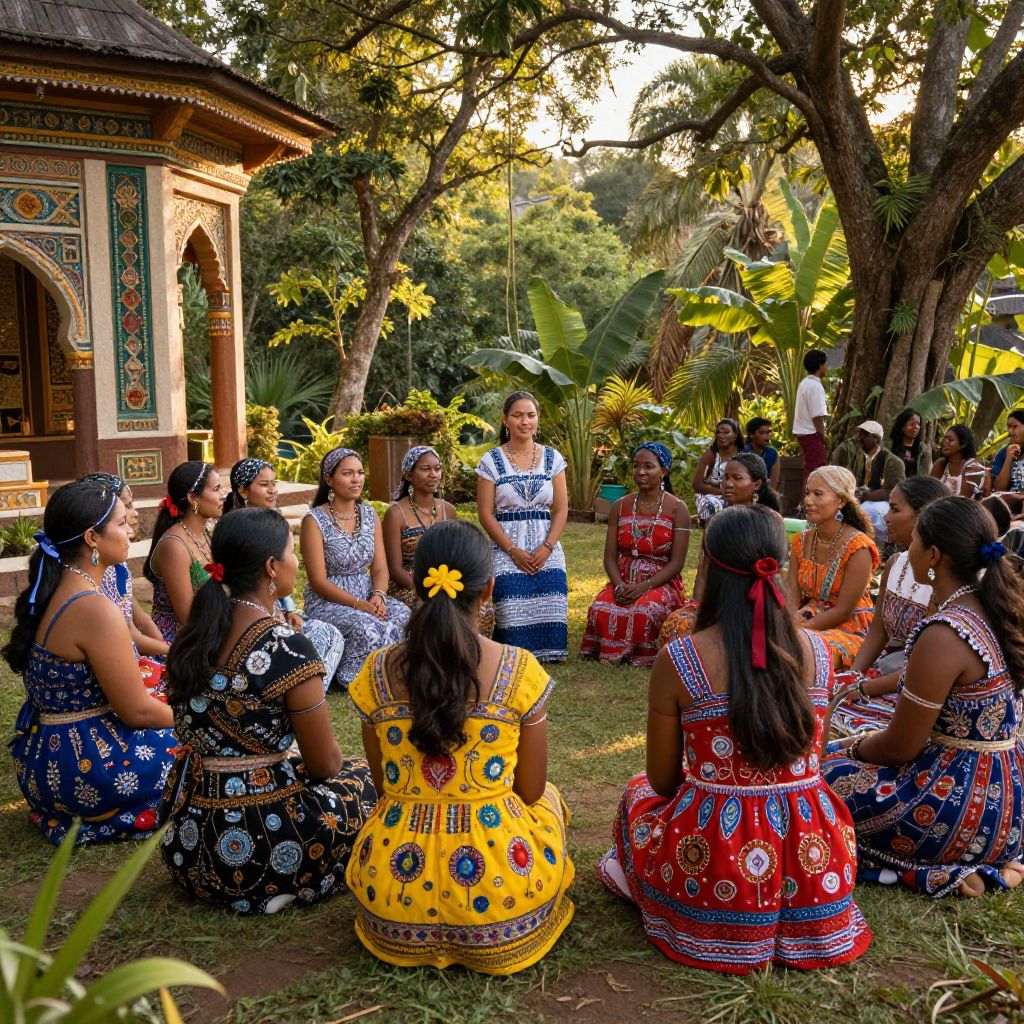 Matriarchy society scene with powerful women leaders, vibrant traditional clothing, lush natural surroundings, symbolic female motifs, warm golden sunlight, intricate architectural details, a harmonious community gathering, realistic style with rich textures and colors.