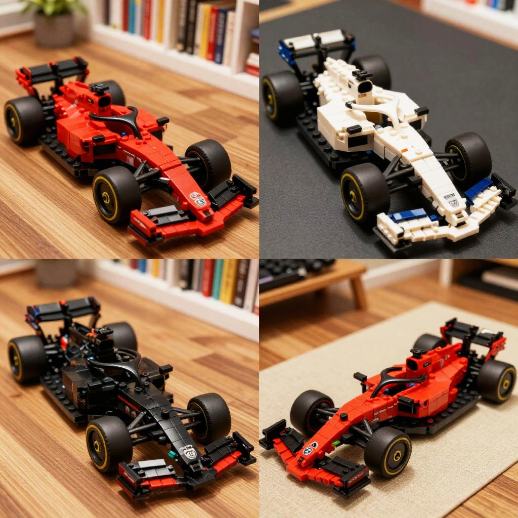 This collage features four colorful photos of LEGO Formula 1 race cars in different settings. The top-left image shows a red and black car on a wooden floor next to bookshelves. The top-right image is a close-up of a red, white, and black car on a dark gray surface. The bottom-left image shows a black and red car on a wooden floor, and the bottom-right image shows another red and black car on a light-colored mat. The cars look detailed and vibrant.